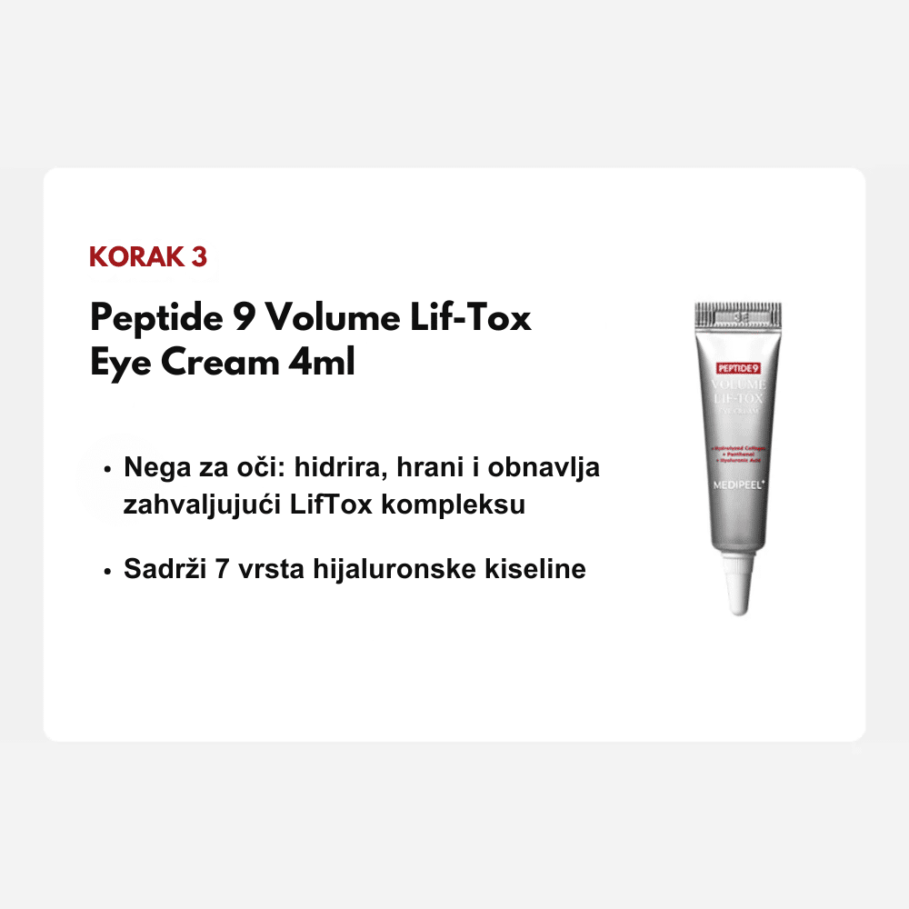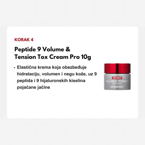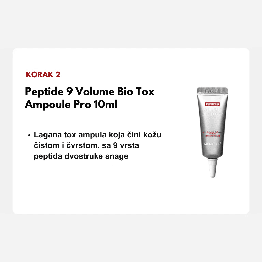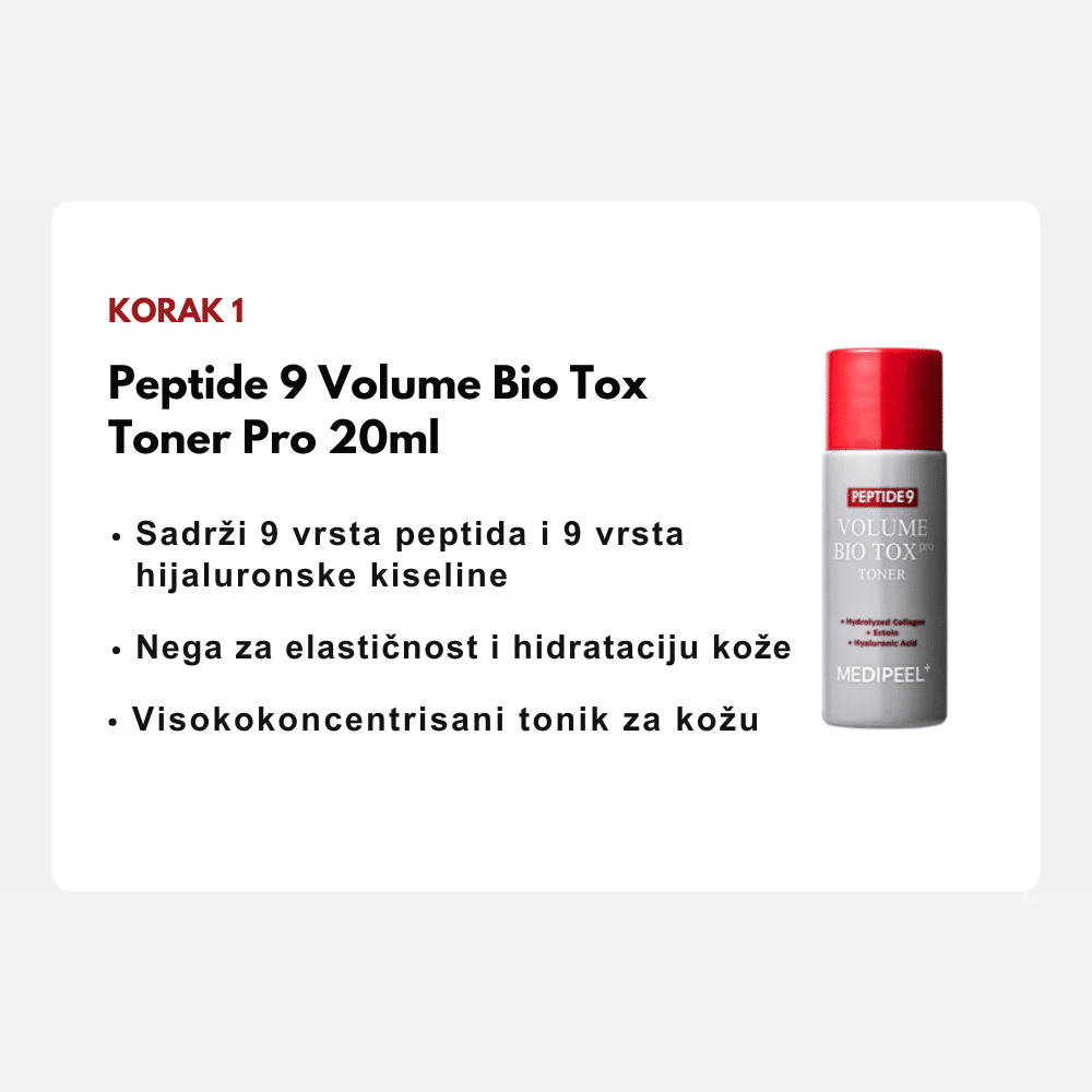 MEDIPEEL Peptide 9 Volume Bio Tox Trial Kit je ekskluzivni set putnih pakovanja koji nudi kompletan režim za lifting i popunjavanje volumena kože u četiri koraka. Ova “Pro” linija predstavlja vrhunac MEDIPEEL anti-aging tehnologije, kombinujući 9 vrsta peptida, Volufiline i astaksantin (jedan od najjačih antioksidanasa na svetu). Set je dizajniran da ciljano deluje na gubitak elastičnosti, duboke bore i dehidrataciju, pružajući koži efekat “botoksa u bočici” kroz sinergiju seruma, tonera i krema.