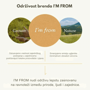 I'm From je korejski kozmetički brend poznat po upotrebi prirodnih sastojaka i tradicionalnih korejskih metoda fermentacije kako bi se postigla efikasna i sigurna nega kože. Njihova filozofija se temelji na transparentnosti i jednostavnosti, koristeći samo najčišće sastojke iz prirode. Brend nudi širok asortiman proizvoda, uključujući tonere, serume, maske i kreme, sa naglaskom na ključne sastojke poput pirinča, meda, mugvorta i ginsenga. Ovi proizvodi su formulirani sa pažljivo odabranim prirodnim sastojcima, kao što su pirinčani toner, medena maska i ginseng serum. I'm From se ističe posvećenostšću kvalitetu i efikasnosti, nudeći proizvode koji kombinuju naučno istraživanje sa praktičnom primenom, što ih čini pouzdanim izborom za one koji traže naprednu negu kože.