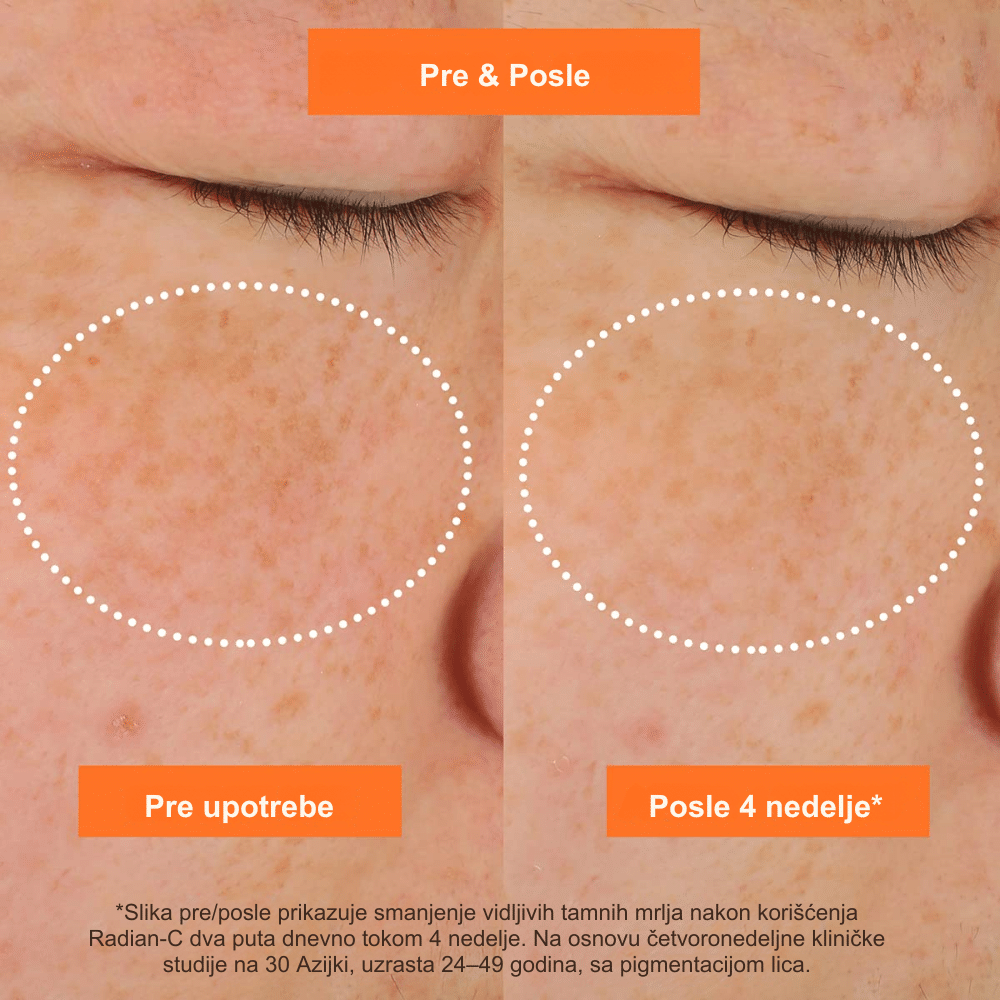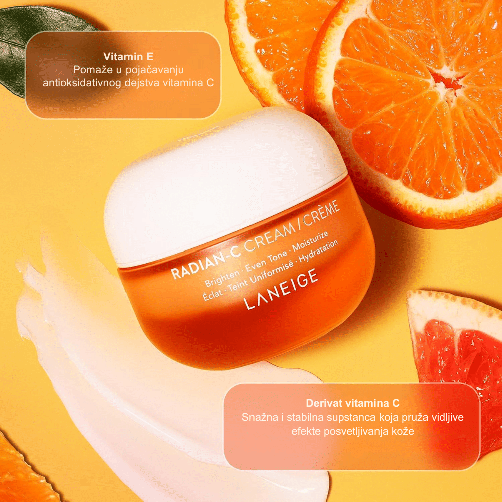 LANEIGE Radian-C Cream 30ml je moćna hidratantna krema formulisana sa 8.5% vitamina C (3-O-Ethyl Ascorbic Acid) i vitamina E, koja posvetljuje kožu, smanjuje tamne mrlje i pruža zaštitu od oksidativnog stresa. Sa stabilnom formom vitamina C ova krema efikasno ujednačava ten, regeneriše kožu i pomaže u smanjenju vidljivosti oštećenja od sunca. Njena lagana, brzo upijajuća tekstura hidrira kožu, ostavljajući je blistavom, glatkom i osveženom. Laneige Radian-C Cream je clean i pogodna za sve tipove kože, uključujući osetljivu. Proizvod je dermatološki testiran, hipoalergen i nekomedogen, što znači da ne zapušava pore.