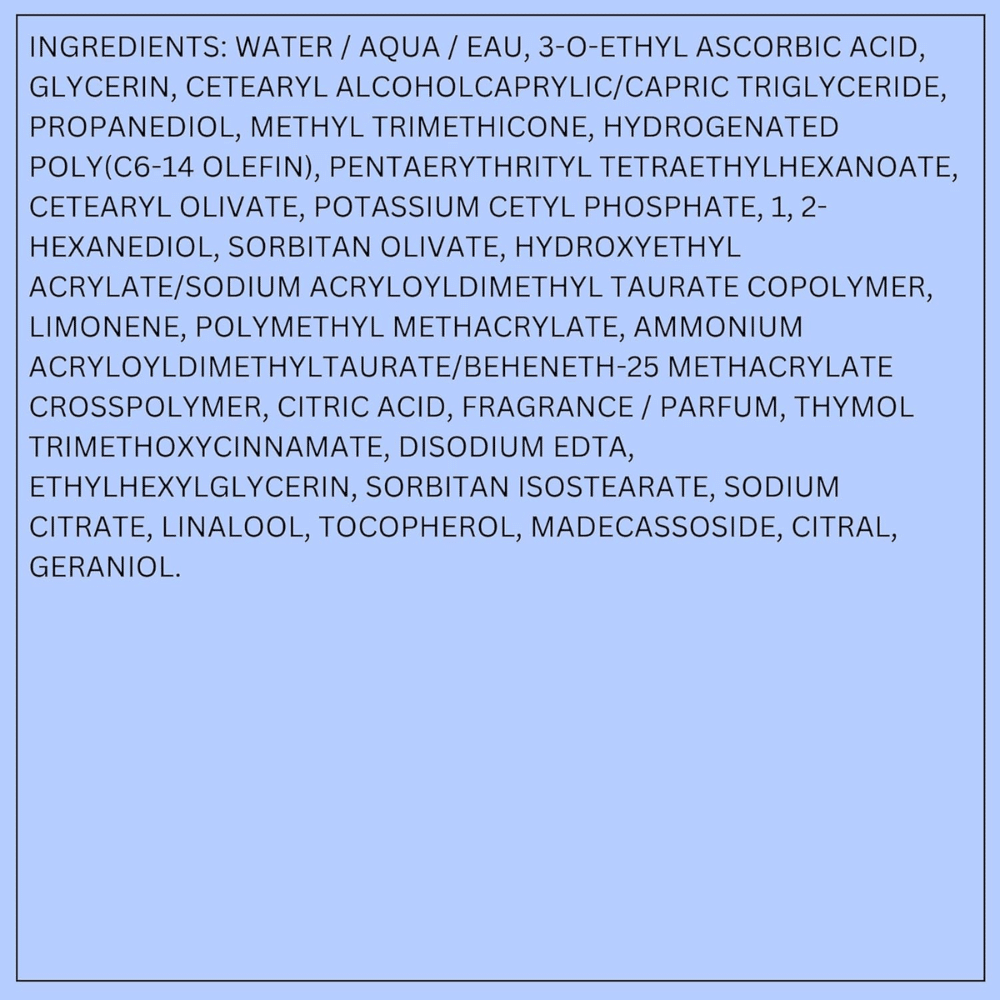 Water / Aqua / Eau, 3-O-Ethyl Ascorbic Acid, Glycerin, Cetearyl Alcohol, Caprylic/Capric Triglyceride, Propanediol, Methyl Trimethicone, Hydrogenated Poly(C6-14 Olefin), Pentaerythrityl Tetraethylhexanoate, Cetearyl Olivate, Potassium Cetyl Phosphate, 1,2-Hexanediol, Sorbitan Olivate, Hydroxyethyl Acrylate/Sodium Acrylolydimethyl Taurate Copolymer, Limonene, Polymethyl Methacrylate, Ammonium Acrylolydimethyltaurate/Beheneth-25 Methacrylate Crosspolymer, Citric Acid, Fragrance / Parfum, Thymoltrimethoxycinnamate, Disodium Edta, Ethylhexylglycerin, Sorbitan Isostearate, Sodium Citrate, Linalool, Tocopherol, Madecassoside, Citral, Geraniol