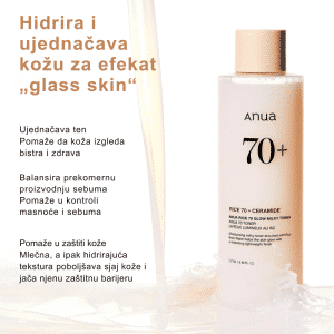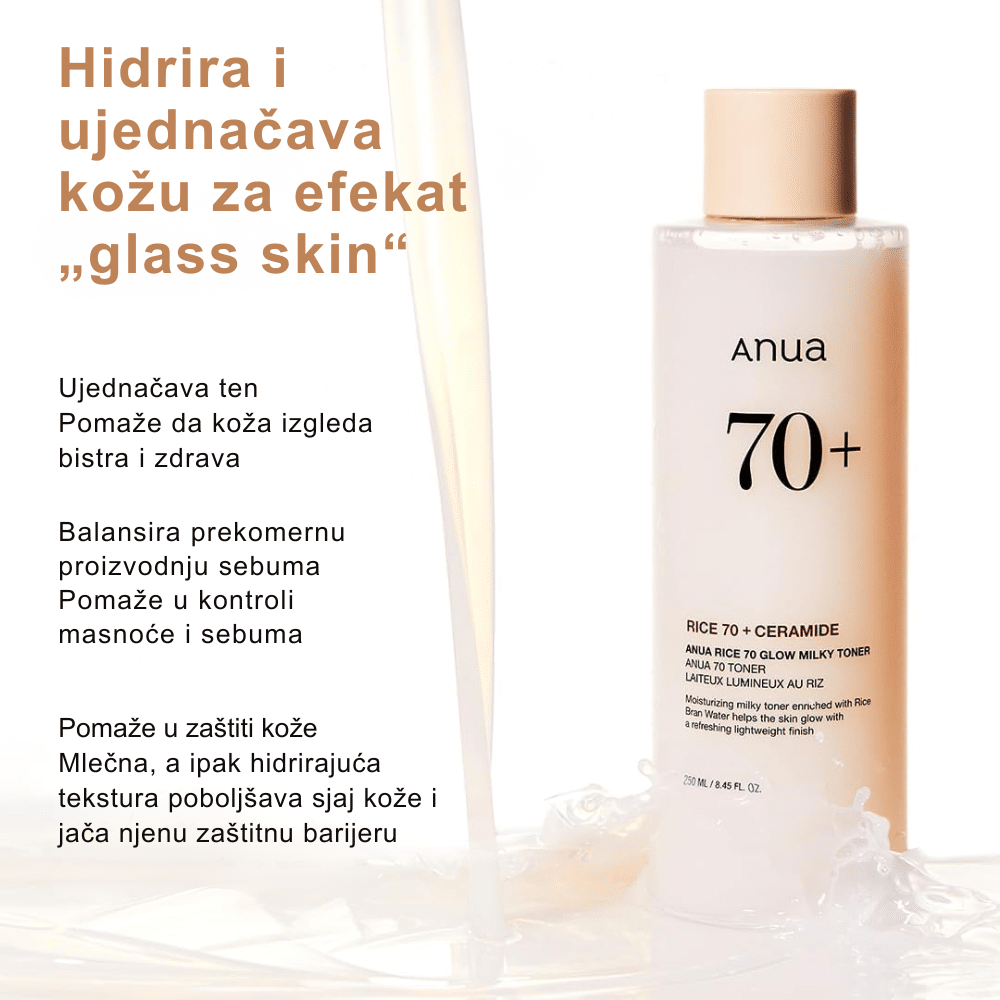 Anua Rice 70 Glow Milky Toner je tonik obogaćen sa 70% ekstrakta pirinča, koji pomaže u hidrataciji, osvežavanju i ujednačavanju tona kože. Ovaj mlečni tonik nežno čisti kožu, uklanja nečistoće i ostavlja je glatkom i blistavom.