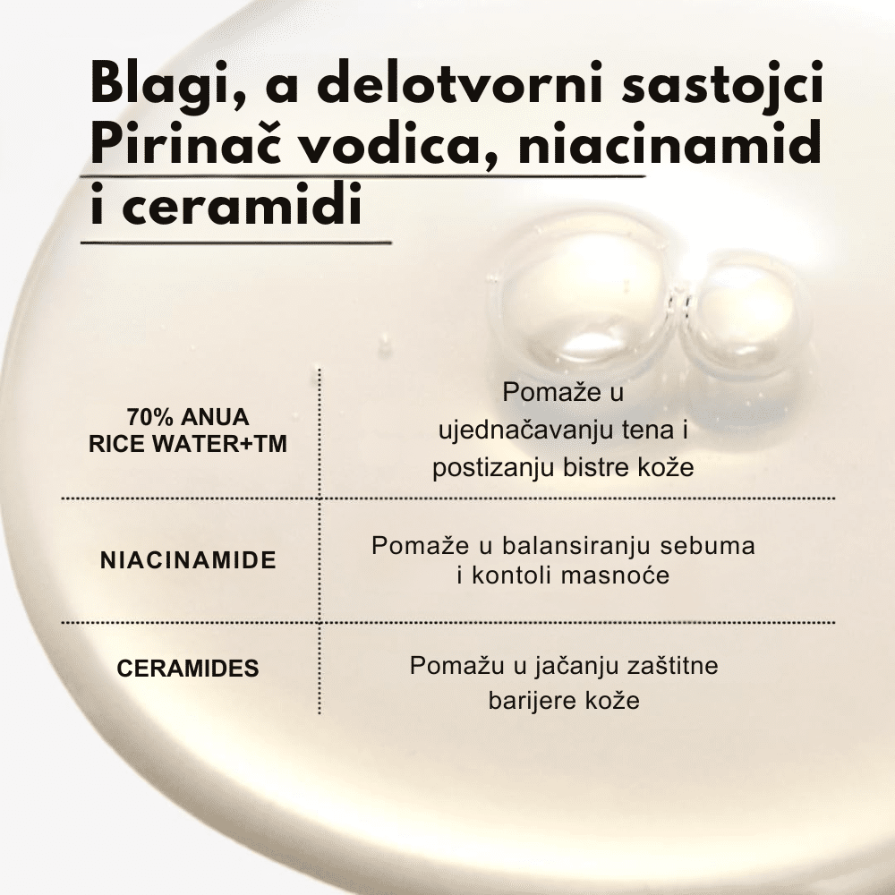 Ekstrakt pirinča je bogat vitaminima i antioksidansima koji smanjuju upale i poboljšavaju ton kože. Dodatno, formula je obogaćena hranljivim sastojcima koji pomažu u očuvanju hidratacije, čineći kožu mekom i zdravog izgleda. Ovaj tonik je idealan za suvu i dehidriranu kožu koja zahteva dodatnu hidrataciju i osveženje.