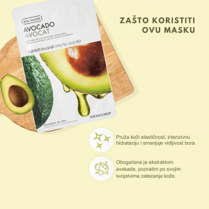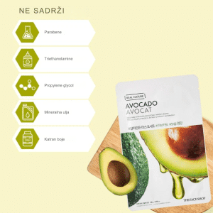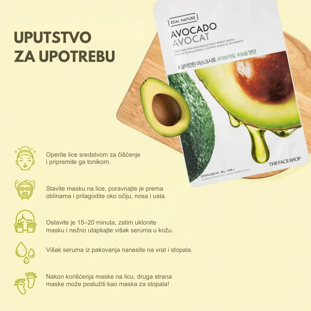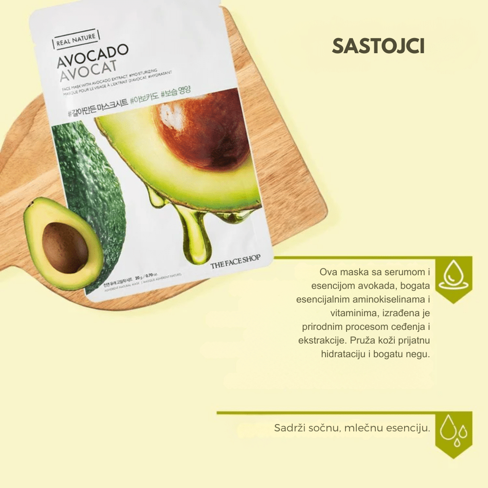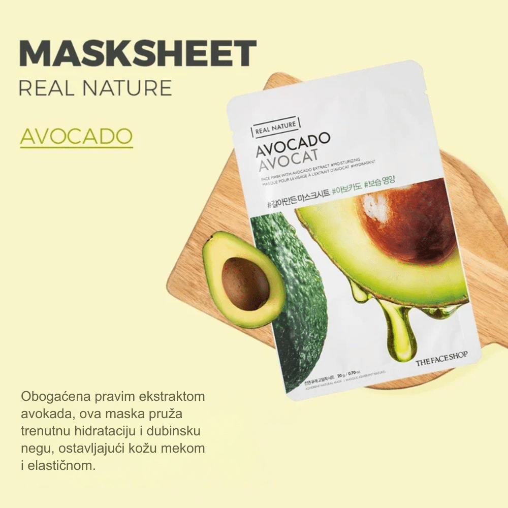 THE FACE SHOP Real Nature Avocado Face Mask je hranljiva sheet maska sa ekstraktom avokada, namenjena intenzivnoj hidrataciji i obnovi suve i umorne kože. Bogata esencija pomaže u obnavljanju lipidne barijere, poboljšava elastičnost i ostavlja kožu mekanom, glatkom i vidno nahranjenom. Idealna je kao brzi tretman kada je koži potrebna dodatna nega, mekoća i zdrav izgled.