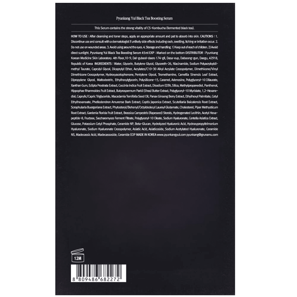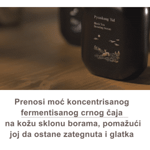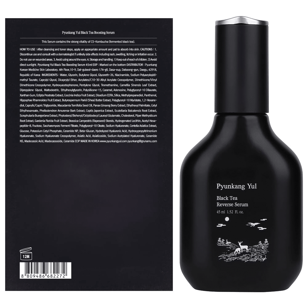Pyunkang Yul Black Tea Boosting Serum 45 ml je bogata formula sa fermentisanim ekstraktom crnog čaja (kombuča), peptidima i adenosinom koja pruža intenzivnu anti-aging negu, povećava elastičnost kože i vraća joj sjaj.