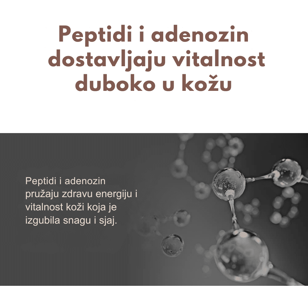 Adenosine – Molekul moći za glatku i mladalačku kožu. Prirodno prisutan u telu, adenozin je poznat po svojim anti-age i regenerativnim svojstvima. Pomaže u smanjenju bora i finih linija, poboljšava elastičnost kože i podstiče proizvodnju kolagena. Takođe, deluje umirujuće i hidrira, ostavljajući kožu glatkom, čvrstom i osveženom.