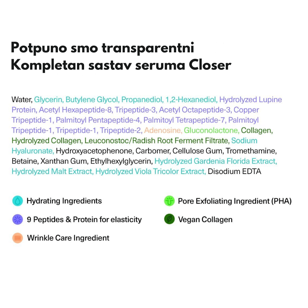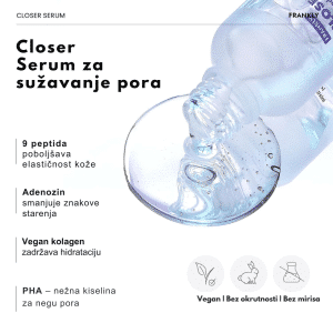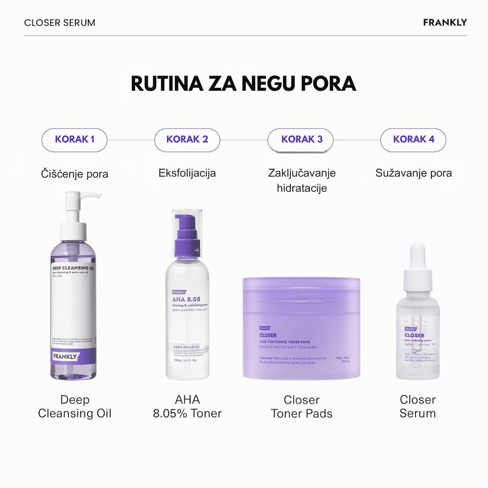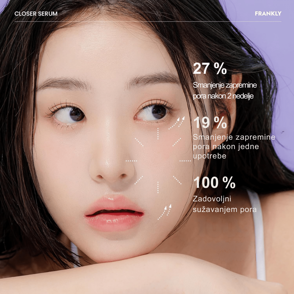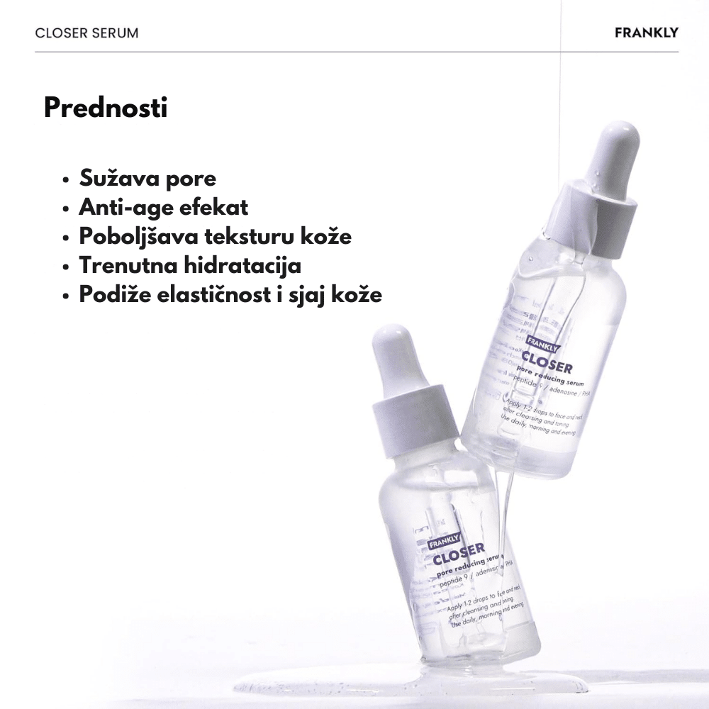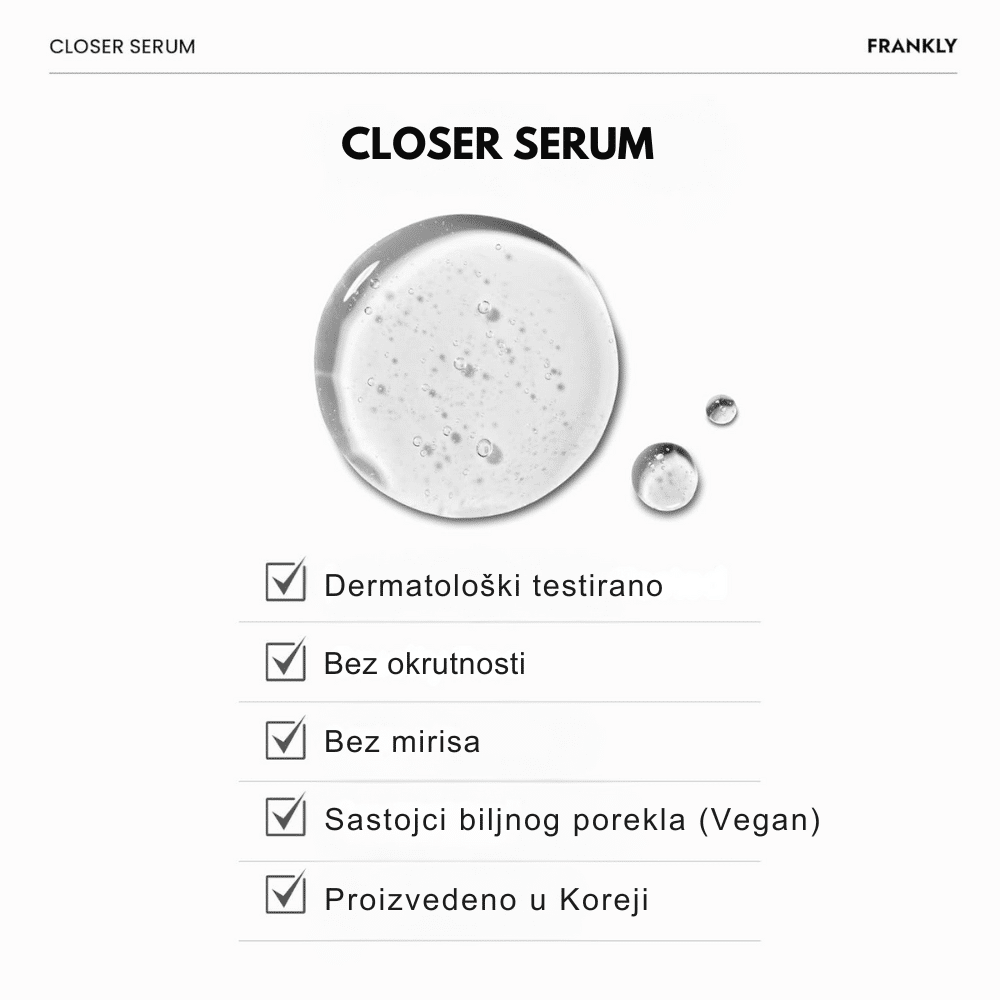 FRANKLY Closer Pore Reducing Serum je lagani serum za kontrolu pora i sebuma, formulisana da vidljivo smanji pore, umiri kožu i poboljša njenu teksturu. Sadrži kombinaciju niacinamida, centele, alantoina i PHA kiseline koja nežno eksfolira, čisti pore i smanjuje neujednačenu površinu kože. Idealan je za kožu sklonu proširenim porama, masnoći i nepravilnostima, ostavljajući je glatkom, pročišćenom i vidljivo ujednačenom.