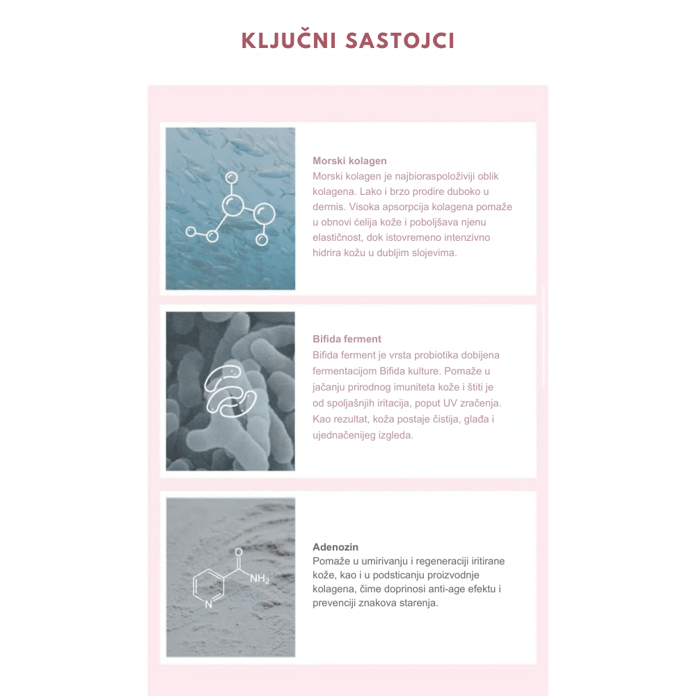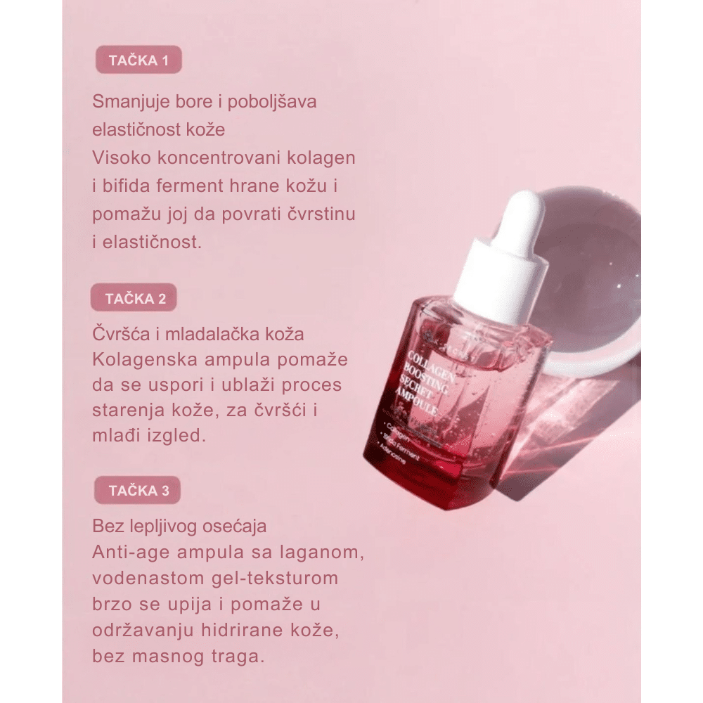 Collagen Boosting Secret Ampoule 30ml je visokokoncentrovani serum za lice koji pruža intenzivnu hidrataciju i poboljšava elastičnost kože. Formulisan sa 254,800 ppm morskog kolagena, bifida fermentom i adenosinom, ovaj serum pomaže u smanjenju vidljivosti finih linija i bora, dok istovremeno jača kožnu barijeru i vraća koži mladalački izgled. Njegova lagana, vodeno-gelasta tekstura brzo se upija bez ostavljanja lepljivog osećaja, čineći ga idealnim za sve tipove kože, uključujući i osetljivu. Upotreba: Nakon čišćenja i toniranja kože, nanesite odgovarajuću količinu seruma na lice i vrat. Ravnomerno rasporedite i nežno umasirajte dok se potpuno ne upije. Koristite svakodnevno, ujutru i uveče, kao deo vaše rutine nege kože. U slučaju iritacije ili neželjenih reakcija, prekinite upotrebu i konsultujte se sa dermatologom.