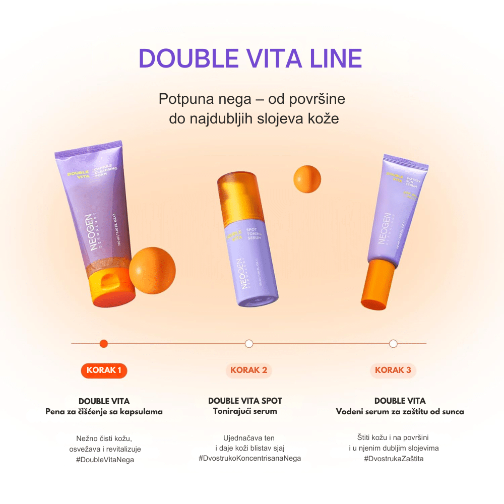 NEOGEN DERMALOGY Double Vita Watery Sun Serum SPF50+ PA++++ je lagani sun serum koji pruža visoku zaštitu od UVA i UVB zračenja. Hidratantna tekstura se brzo upija i idealna je za svakodnevnu upotrebu.