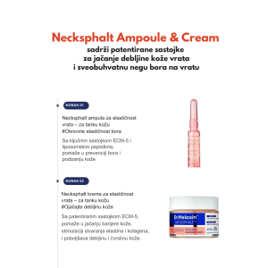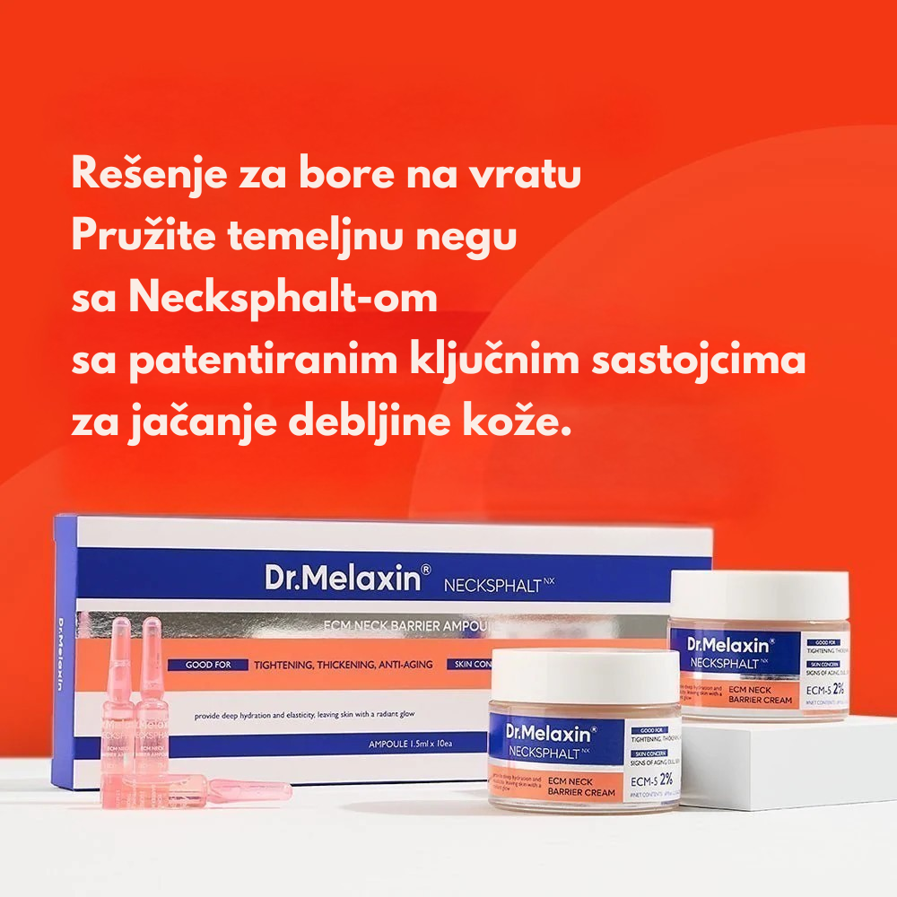 Dr.Melaxin Necksphalt ECM Ceramide Neck Serum predstavlja intenzivan serum u ampulama namenjen nezi kože vrata — sadrži patentirani kompleks ECM-5, ceramide i peptide u koncentraciji koja doprinosi jačanju barijere, poboljšanju čvrstoće i vidljivom smanjenju bora i znakova opuštanja.