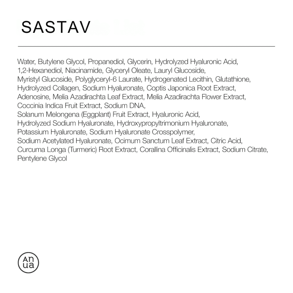 Water, Butylene Glycol, Propanediol, Glycerin, Hydrolyzed Hyaluronic Acid, 1,2-Hexanediol, Niacinamide, Glyceryl Oleate, Lauryl Glucoside, Myristyl Glucoside, Polyglyceryl-6 Laurate, Hydrogenated Lecithin, Glutathione, Hydrolyzed Collagen, Sodium Hyaluronate, Coptis Japonica Root Extract, Adenosine, Sodium DNA, Hyaluronic Acid, Hydrolyzed Sodium Hyaluronate, Hydroxypropyltrimonium Hyaluronate, Potassium Hyaluronate, Sodium Hyaluronate Crosspolymer, Sodium Acetylated Hyaluronate, Melia Azadirachta Leaf Extract, Melia Azadirachta Flower Extract, Coccinia Indica Fruit Extract, Solanum Melongena (Eggplant) Fruit Extract, Ocimum Sanctum Leaf Extract, Citric Acid, Curcuma Longa (Turmeric) Root Extract, Corallina Officinalis Extract, Sodium Citrate, Pentylene Glycol.