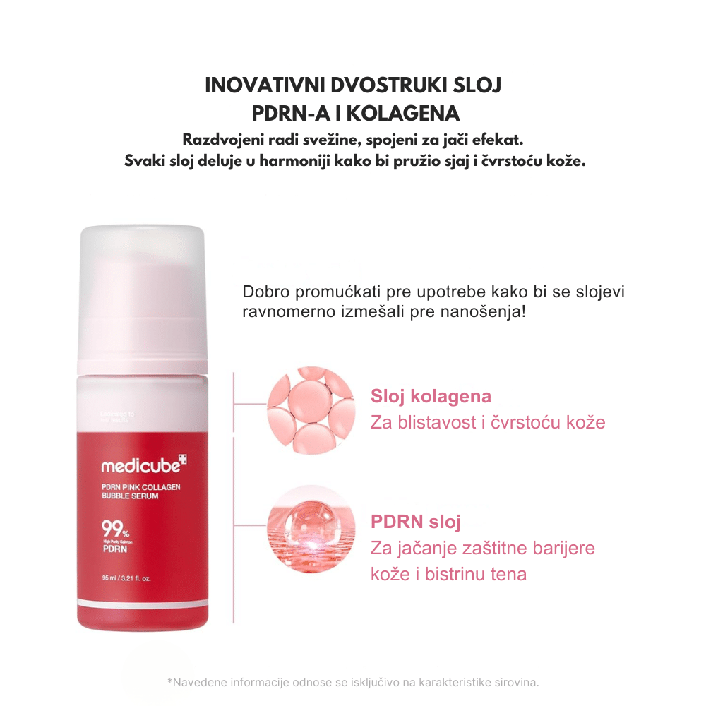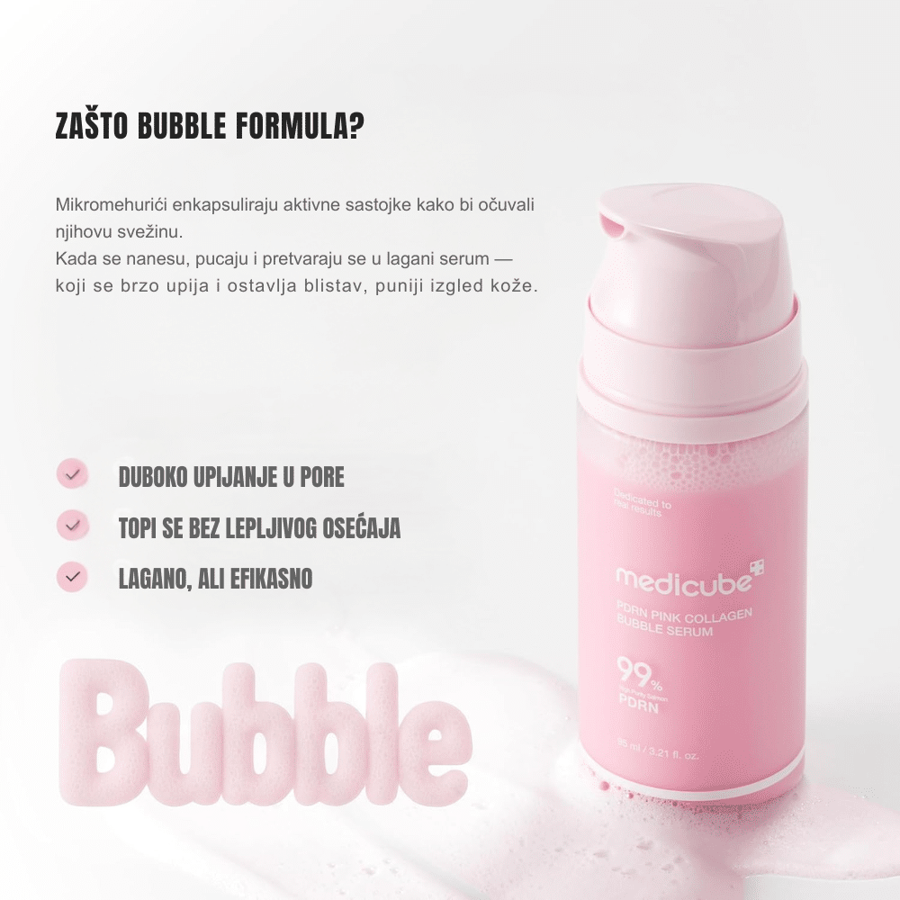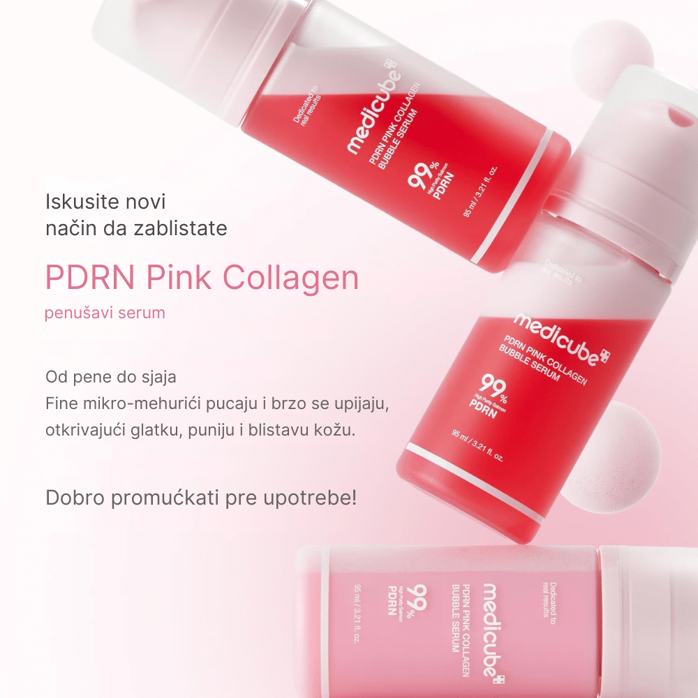 Medicube PDRN Pink Collagen Bubble Serum predstavlja sam vrhunac senzorne i tehnološke inovacije u svetu korejske kozmetike. Ovaj serum se izdvaja svojom jedinstvenom “bubble” teksturom – laganom penom koja pri kontaktu sa kožom “puca” i oslobađa mikroskopske čestice aktivnih sastojaka direktno u pore. Njegova magija leži u kombinaciji PDRN-a (dobijenog iz lososove DNK ili biljnih izvora u zavisnosti od serije) koji regeneriše ćelije, i ružičastog kolagena koji vraća koži izgubljenu elastičnost i čvrstinu.