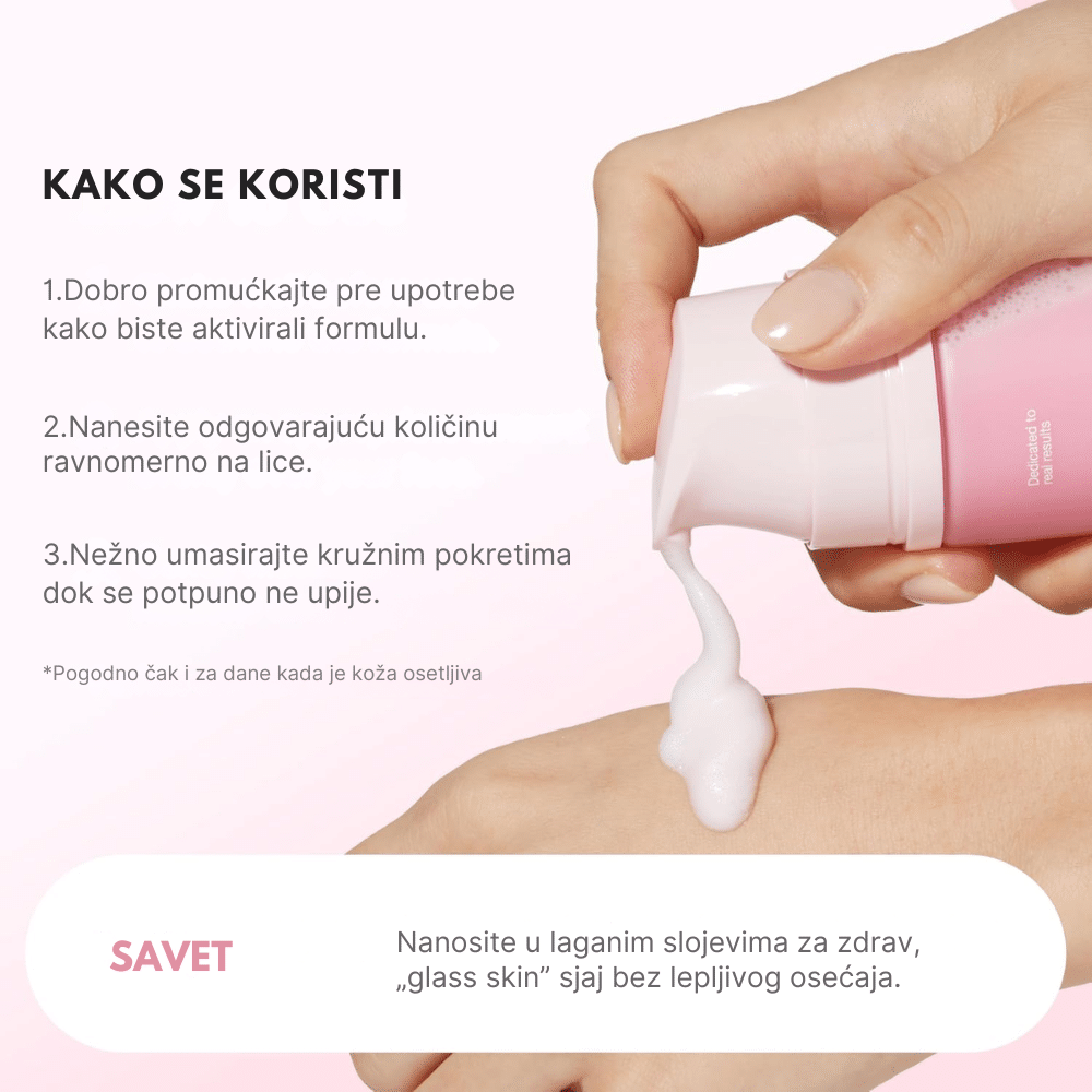 Serum koristite ujutru i uveče nakon čišćenja lica i nanošenja tonera. Istisnite 1-2 pumpice pene na dlan ili direktno na obraze. Nežno nanesite penu po celom licu, izbegavajući direktan kontakt sa očima. Sačekajte nekoliko sekundi dok mehurići počnu da se “rastapaju”, a zatim lagano utapkajte dlanovima dok se serum potpuno ne upije. Ne ispirati. Zbog svoje lagane vazdušaste strukture, serum je idealan za slojevito nanošenje (layering) ukoliko vam je potrebna dodatna hidratacija. Čuvajte bočicu uspravno na hladnom mestu i izbegavajte izlaganje direktnoj toploti kako biste očuvali formiranje mehurića.