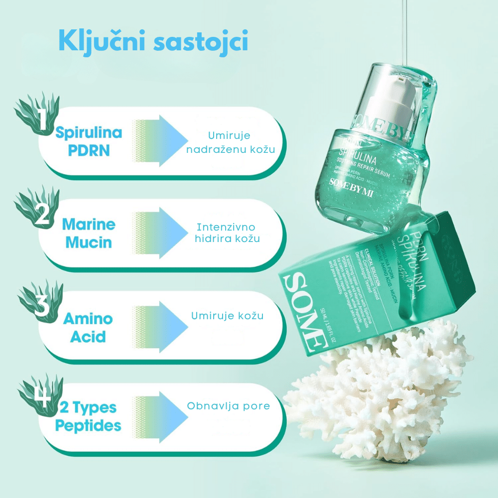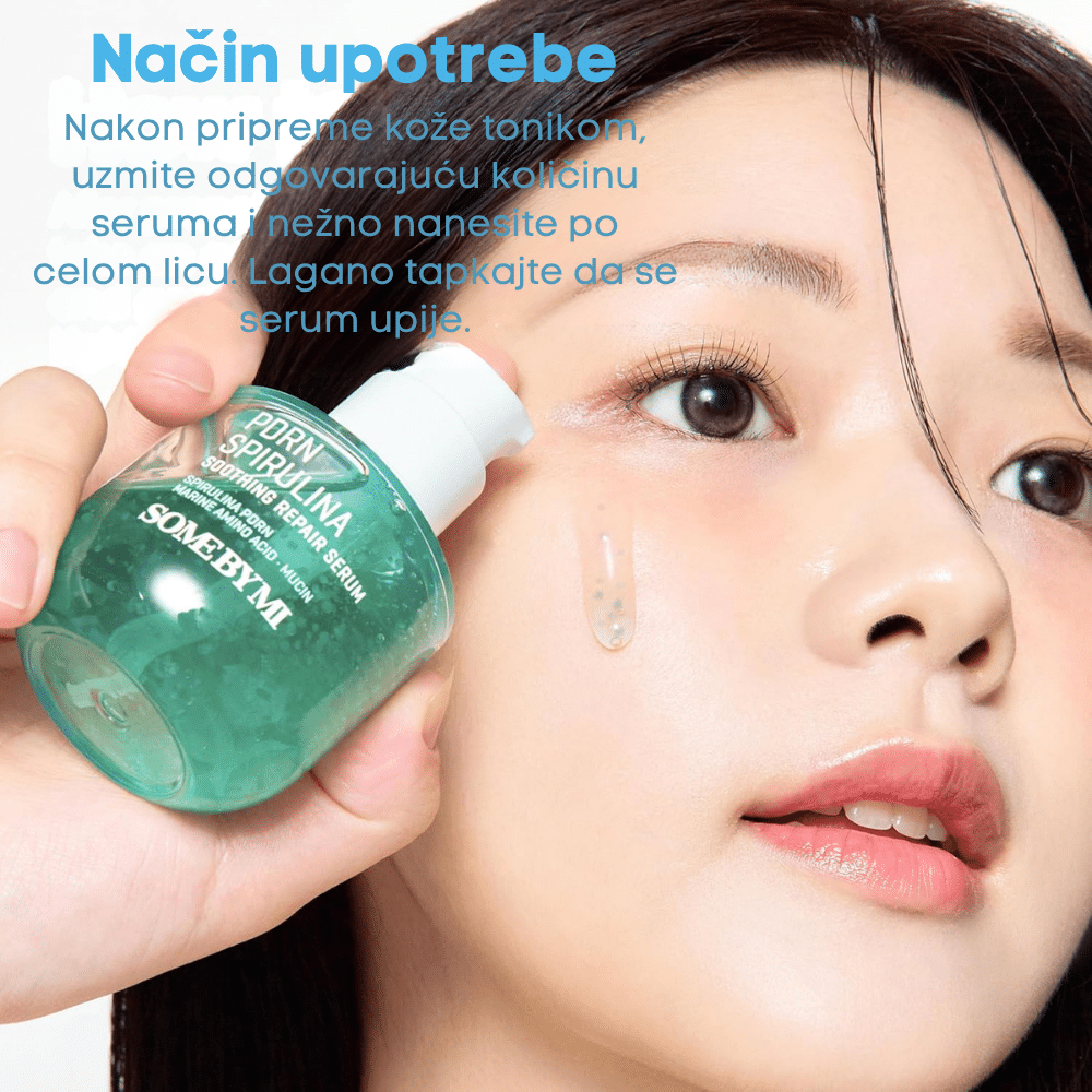 SOME BY MI PDRN Spirulina Soothing Repair Serum je lagani, brzo upijajući serum sa PDRN-om izvedenim iz spiruline, morskim aminokiselinama i hijaluronskom kiselinom koji umiruje nadraženu kožu, jača barijeru i vraća joj elastičnost.