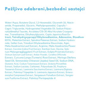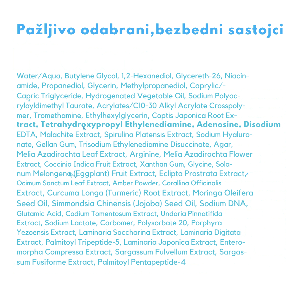 Water (Aqua), Butylene Glycol, 1,2-Hexanediol, Glycereth-26, Niacinamide, Propanediol, Glycerin, Methylpropanediol, Caprylic/Capric Triglyceride, Hydrogenated Vegetable Oil, Sodium Polyacryloyldimethyl Taurate, Acrylates/C10-30 Alkyl Acrylate Crosspolymer, Tromethamine, Ethylhexylglycerin, Coptis Japonica Root Extract, Tetrahydroxypropyl Ethylenediamine, Adenosine, Disodium EDTA, Malachite Extract, Spirulina Platensis Extract, Sodium Hyaluronate, Gellan Gum, Trisodium Ethylenediamine Disuccinate, Agar, Melia Azadirachta Leaf Extract, Arginine, Melia Azadirachta Flower Extract, Coccinia Indica Fruit Extract, Xanthan Gum, Glycine, Solanum Melongena (Eggplant) Fruit Extract, Eclipta Prostrata Extract, Ocimum Sanctum Leaf Extract, Amber Powder, Corallina Officinalis Extract, Curcuma Longa Root Extract, Moringa Oleifera Seed Oil, Simmondsia Chinensis ( Jojoba ) Seed Oil, Sodium DNA (PDRN), Glutamic Acid, Codium Tomentosum Extract, Undaria Pinnatifida Extract, Sodium Lactate, Carbomer, Polysorbate 20, Porphyra Yezoensis Extract, Laminaria Saccharina Extract, Laminaria Digitata Extract, Laminaria Japonica Extract, Enteromorpha Compressa Extract, Sargassum Fulvellum Extract, Sargassum Fusiforme Extract, Palmitoyl Tripeptide-5, Palmitoyl Pentapeptide-4.
