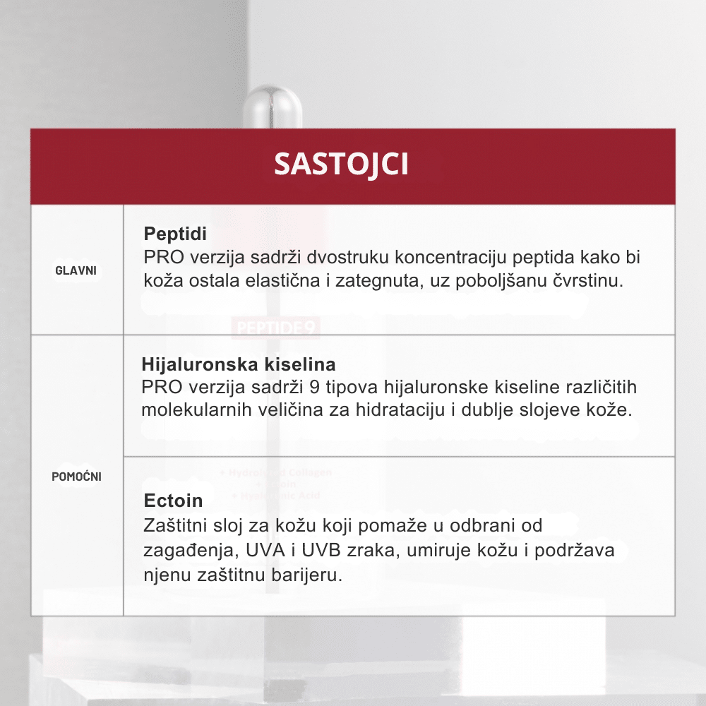 Peptidi su kratki lanci aminokiselina koji služe kao gradivni blokovi proteina poput kolagena, elastina i keratina, ključnih za čvrstoću, elastičnost i zdrav izgled kože. U kozmetici se koriste zbog svoje sposobnosti da podstaknu proizvodnju kolagena, smanje bore, poboljšaju teksturu kože i ojačaju njenu barijeru. Postoji više vrsta peptida, uključujući signalne peptide koji stimulišu regeneraciju kože, transportne peptide koji poboljšavaju apsorpciju drugih sastojaka i inhibitore neurotransmitera koji deluju slično botoksu, smanjujući mimičke bore. Blagi su i pogodni za sve tipove kože, a najbolje rezultate daju kada se koriste u kombinaciji sa hijaluronskom kiselinom, ceramidima i antioksidansima.