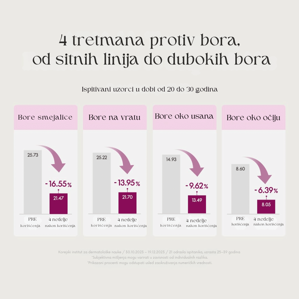 Uveče, nakon čišćenja i toniranja, nanesite 2–3 kapi seruma i lagano umasirajte dok se ne upije. Nakon toga nanesite malu količinu kreme direktno na područja sa borama, poput čela, oko očiju ili nazolabijalnih linija. Kremu koristiti 2–3 puta nedeljno i postepeno povećavati učestalost. Tokom dana obavezno koristiti SPF zaštitu.
