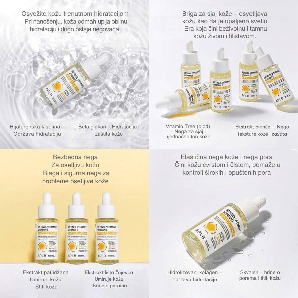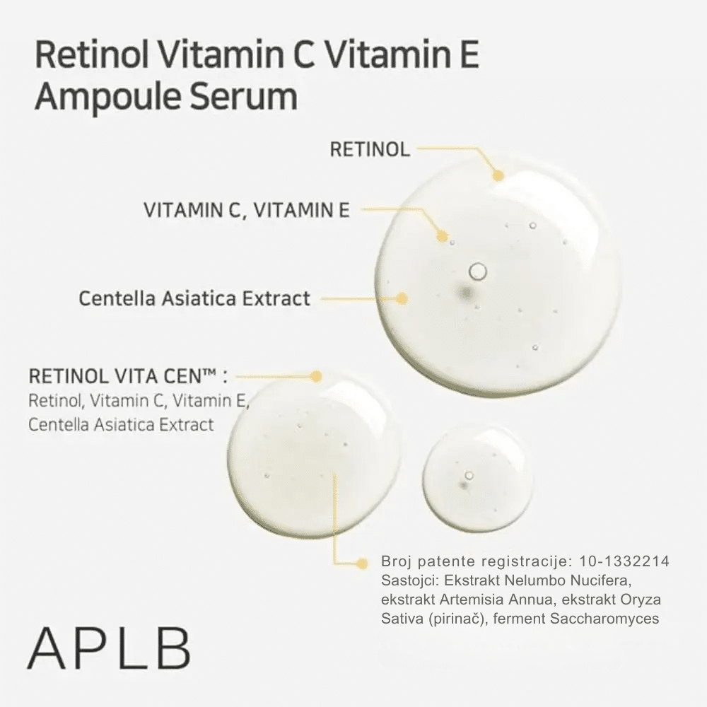 APLB Retinol Vitamin C Vitamin E Ampoule Serum je koncentrovani serum namenjen obnovi kože, ujednačavanju tena i poboljšanju teksture. Kombinacija retinola, vitamina C i vitamina E pomaže u smanjenju vidljivosti finih linija, nepravilnosti i znakova umora, dok koži vraća svežinu, sjaj i elastičnost.