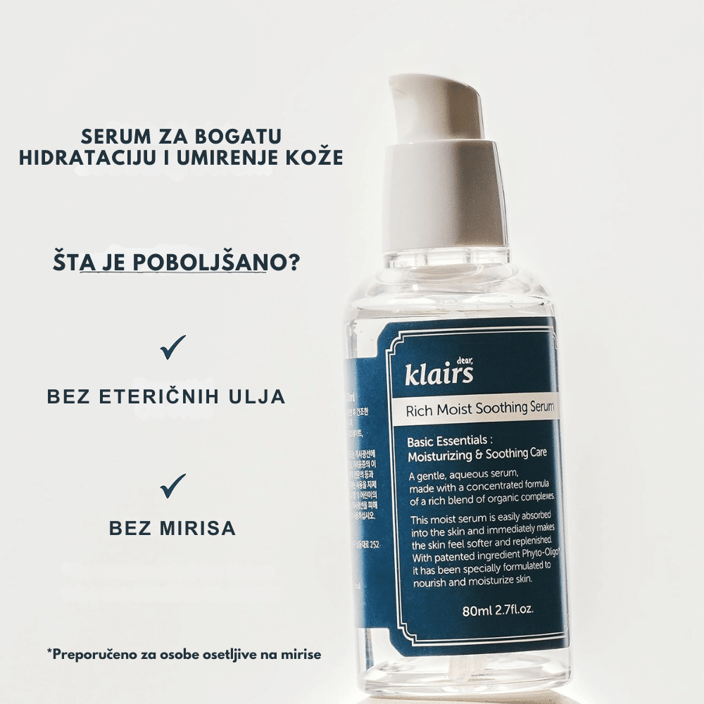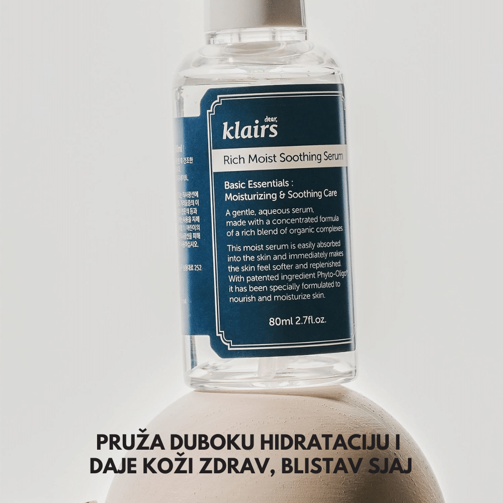 dear, klairs Rich Moist Soothing Serum je hidratantni serum namenjen suvoj i osetljivoj koži. Pruža intenzivnu hidrataciju, umiruje iritacije i pomaže u jačanju prirodne barijere kože.