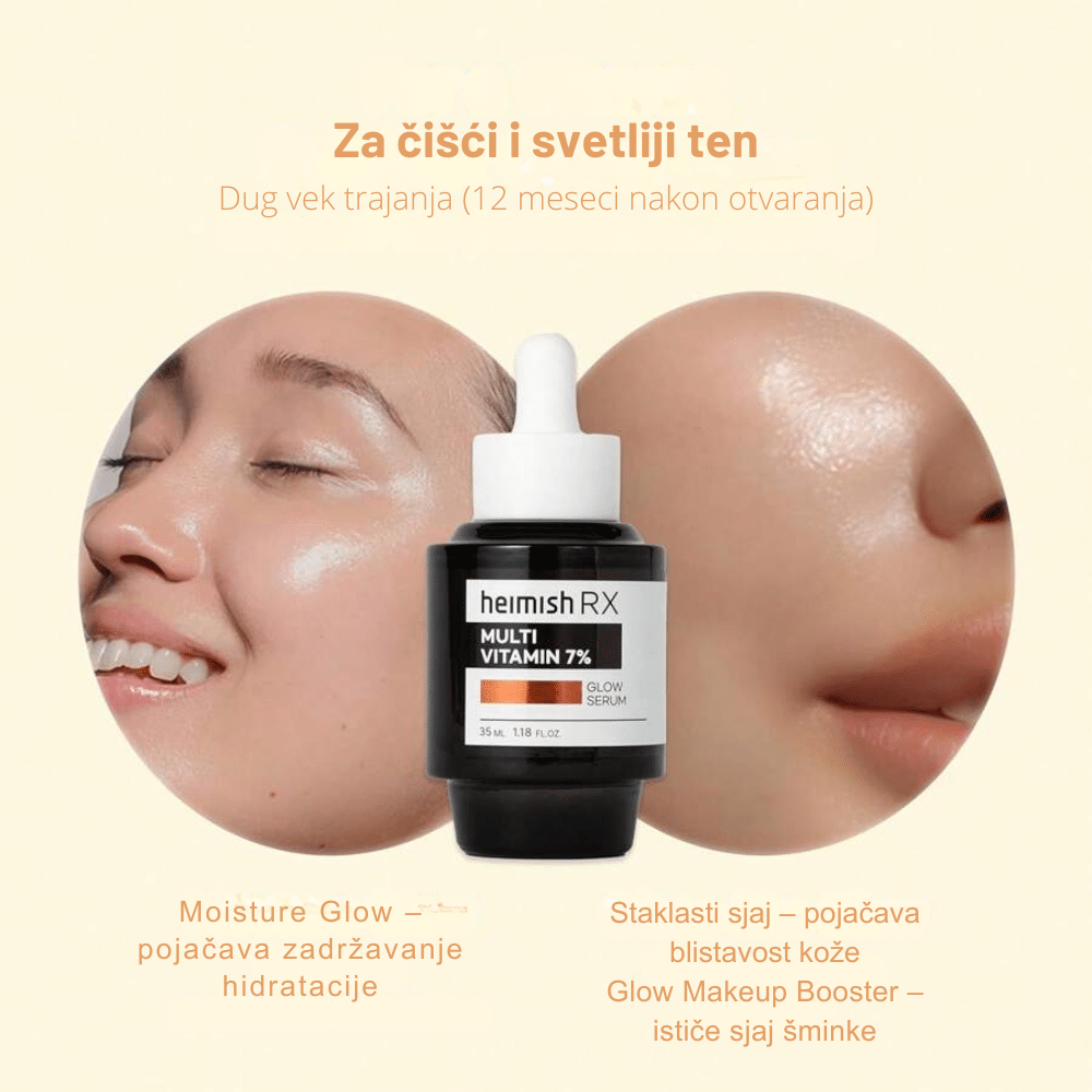 Heimish Rx Multi Vitamin Glow Serum 35ml je snažan serum obogaćen sa vitaminima i antioksidansima koji dubinski revitalizuje kožu, vraća joj prirodni sjaj i poboljšava tonus. Ovaj serum je formulisan sa vitaminom C, vitaminom E i niacinamidom, koji pomažu u smanjenju hiperpigmentacije, ujednačavanju tena i poboljšanju elastičnosti kože. Vitamin C je moćan antioksidans koji smanjuje tamne mrlje i poboljšava blistavost, dok niacinamid umiruje kožu, smanjuje crvenilo i pojačava hidrataciju. Heimish Rx Multi Vitamin Glow Serum je savršen za kožu koja je sklona umoru, zagađenju ili starenju, jer intenzivno hrani, hidratizuje i poboljšava teksturu. Formula se brzo upija, ostavljajući kožu glatkom, mekom i zdravog izgleda, dok joj pruža blistavost i prirodni sjaj.