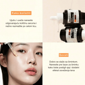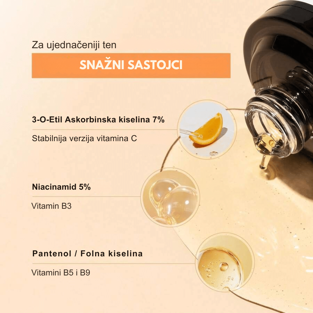 Serum sa vitaminima C, E i niacinamidom koji poboljšava tonus, smanjuje tamne mrlje i vraća koži prirodni sjaj i blistavost.