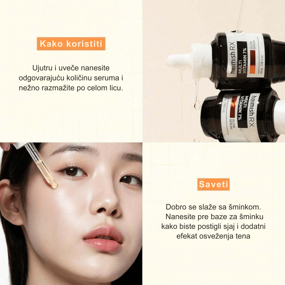 Nanesite nekoliko kapi Heimish Rx Multi Vitamin Glow Serum na očišćeno i tonirano lice. Lagano tapkajte dok se serum potpuno ne upije u kožu. Koristite ujutro i uveče kao deo rutine za poboljšanje tonusa, hidrataciju i blistavost kože.