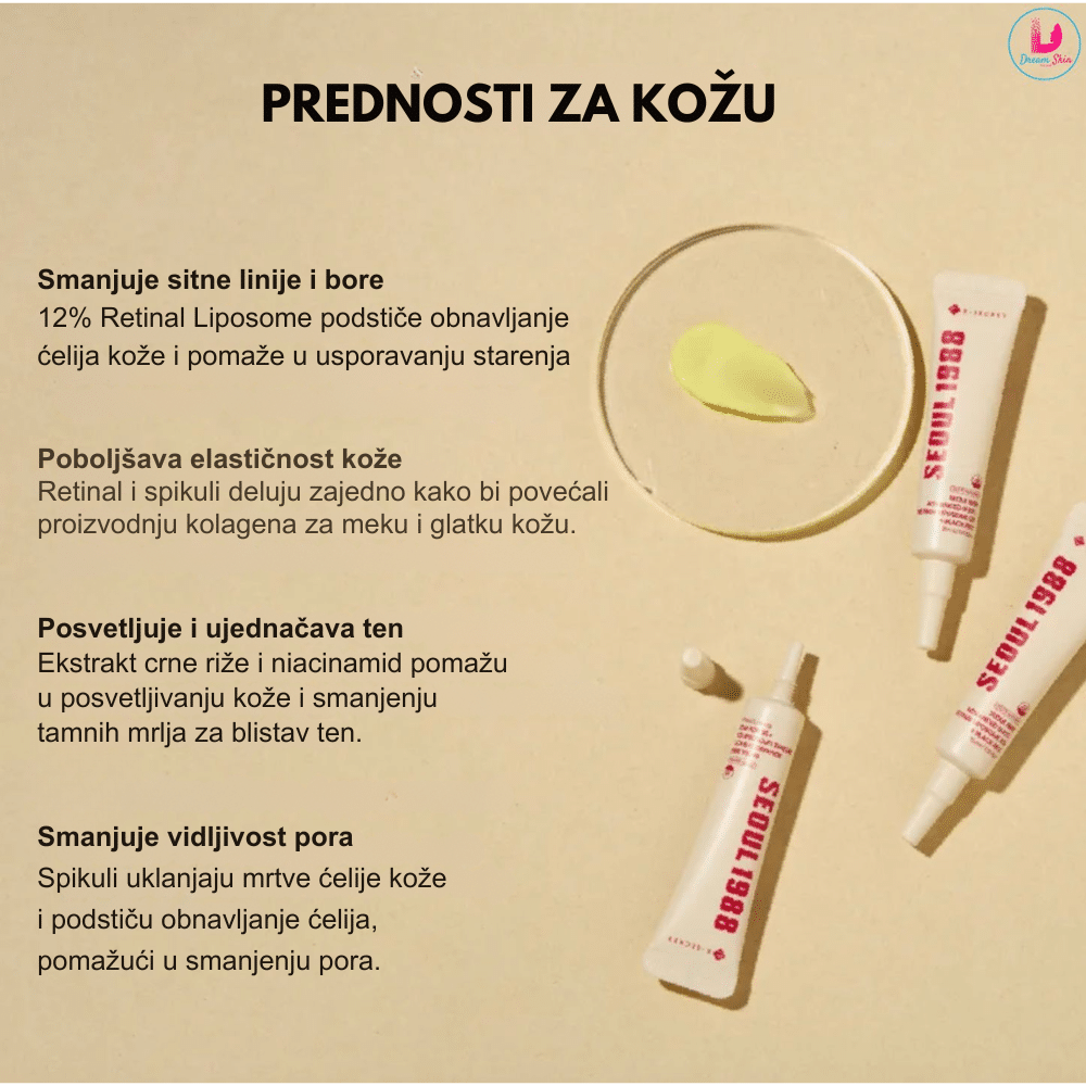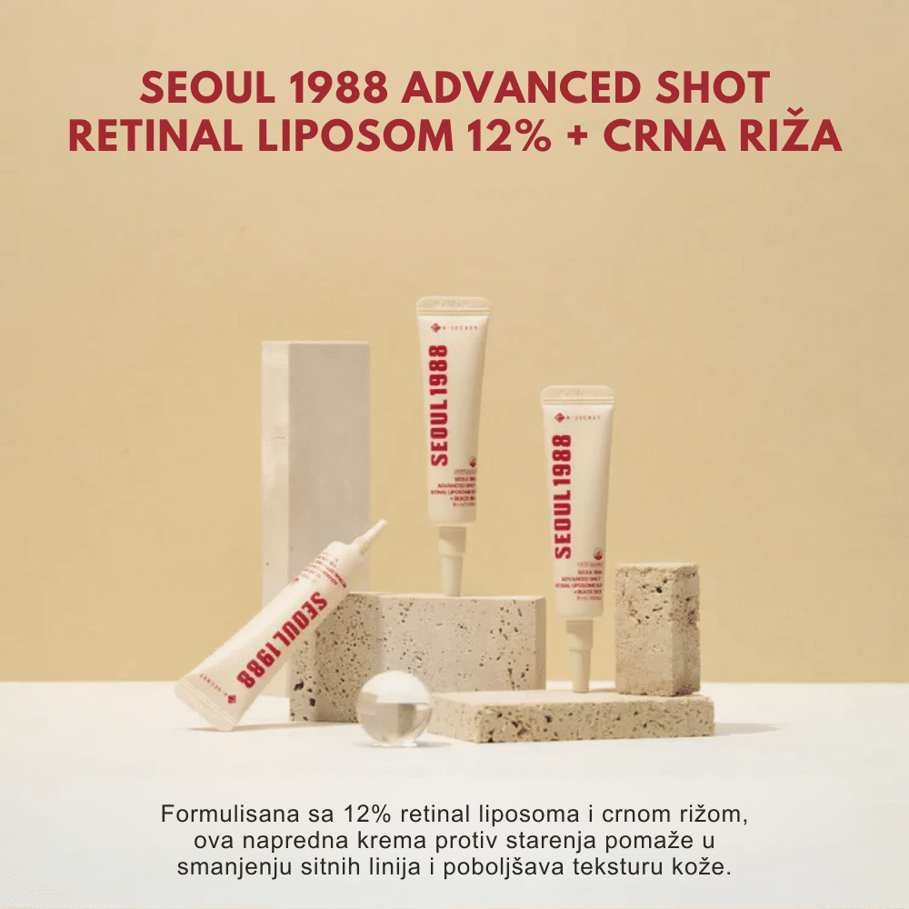 KSECRET SEOUL 1988 Advanced Shot je visokokoncentrovani retinalni tretman koji kombinuje 12% retinal liposoma i black rice ekstrakt kako bi pružio snažno anti-age dejstvo, regeneraciju i ujednačavanje teksture kože. Retinal, stabilniji i brže delujući oblik vitamina A, poboljšava elastičnost, ublažava bore i posvetljuje tamne fleke, dok crni pirinač pruža antioksidativnu zaštitu i hidrataciju. Formula je obogaćena umirujućim sastojcima koji smanjuju iritacije i omogućavaju efikasne rezultate uz nežan osećaj na koži.