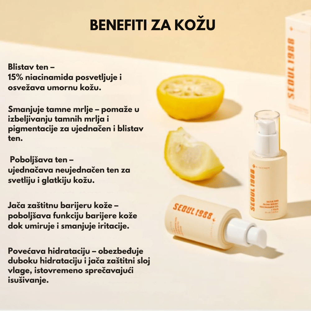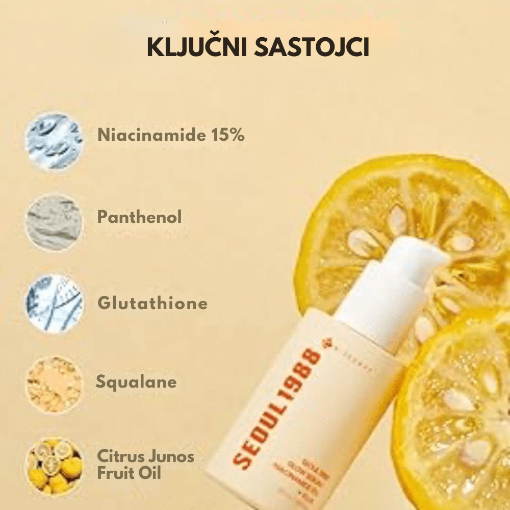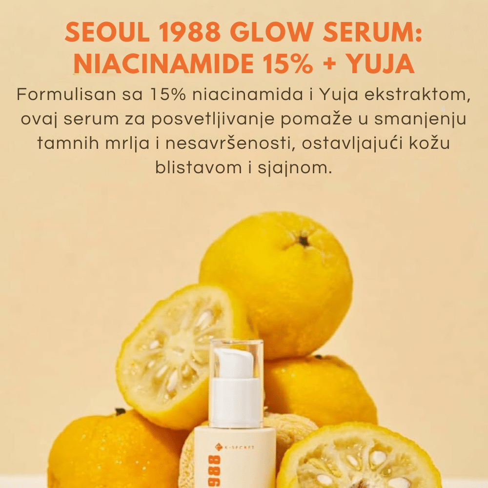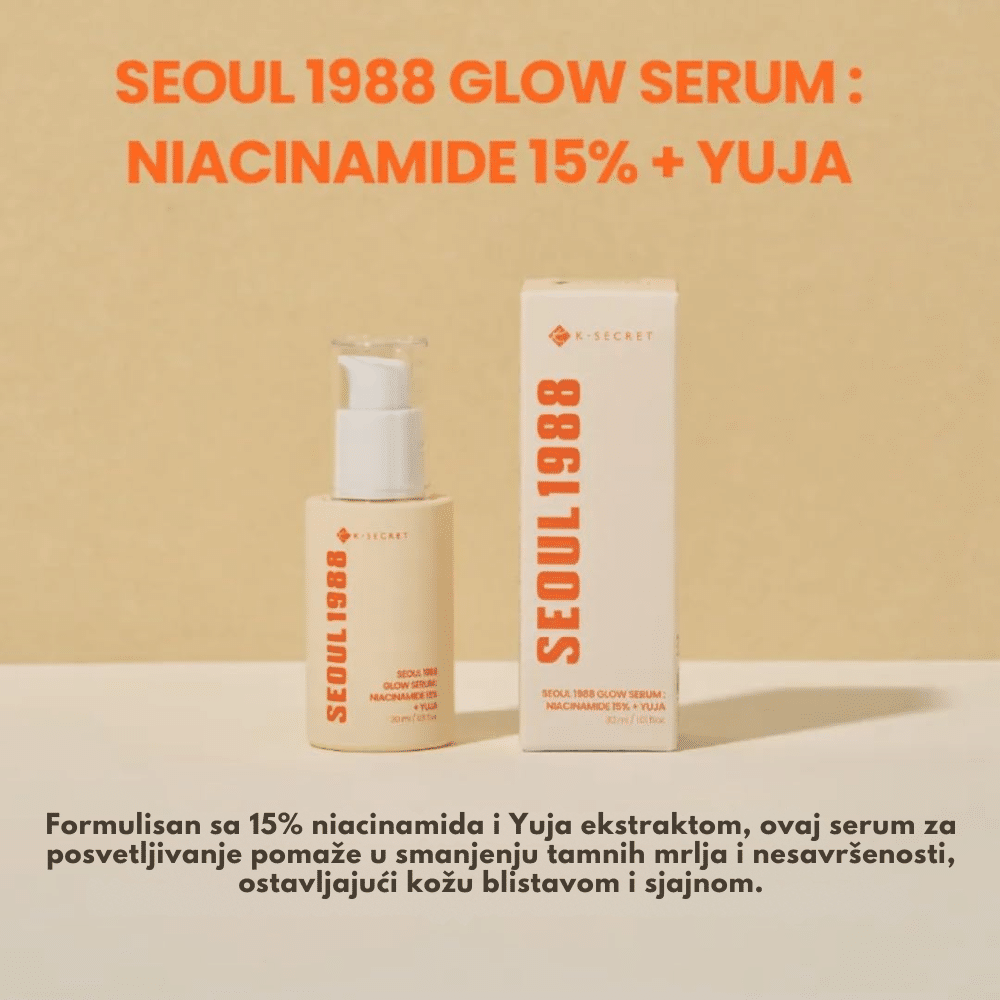 KSECRET SEOUL 1988 Glow Serum kombinuje visokih 15% niacinamida i snažnu koncentraciju yuja ekstrakta kako bi posvetlio kožu, ujednačio ten i smanjio vidljivost tamnih fleka. Ovaj serum istovremeno smanjuje sebum, zaglađuje teksturu i pruža prirodan glow efekat. Lagana, brzo upijajuća formula obogaćena je hidratantnim i umirujućim sastojcima koji ostavljaju kožu glatkom, blistavom i vidljivo osveženom.