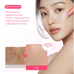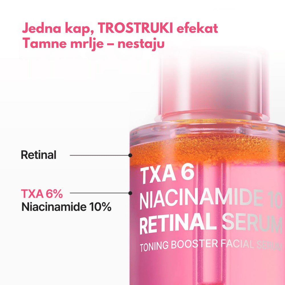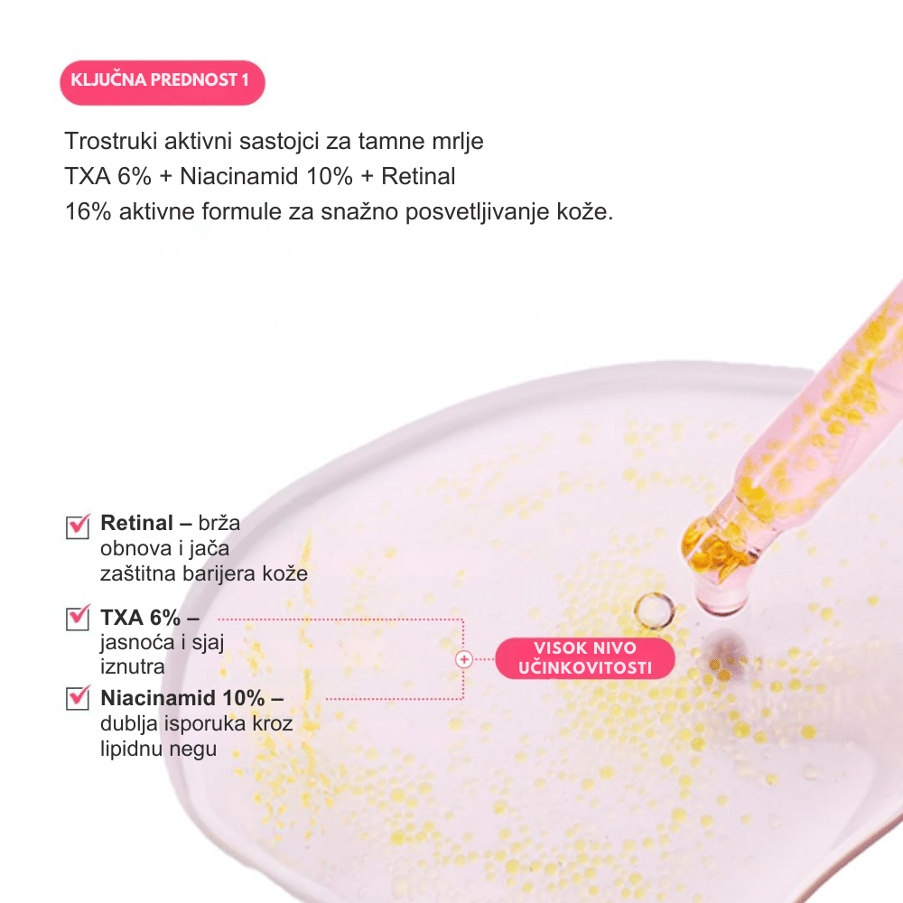 Uklonite tamne fleke i bore uz serum sa 6% TXA, 10% niacinamida i retinalom. Intenzivno prosvetljuje ten, ubrza regeneraciju i vraća koži čvrstinu i glatku teksturu.