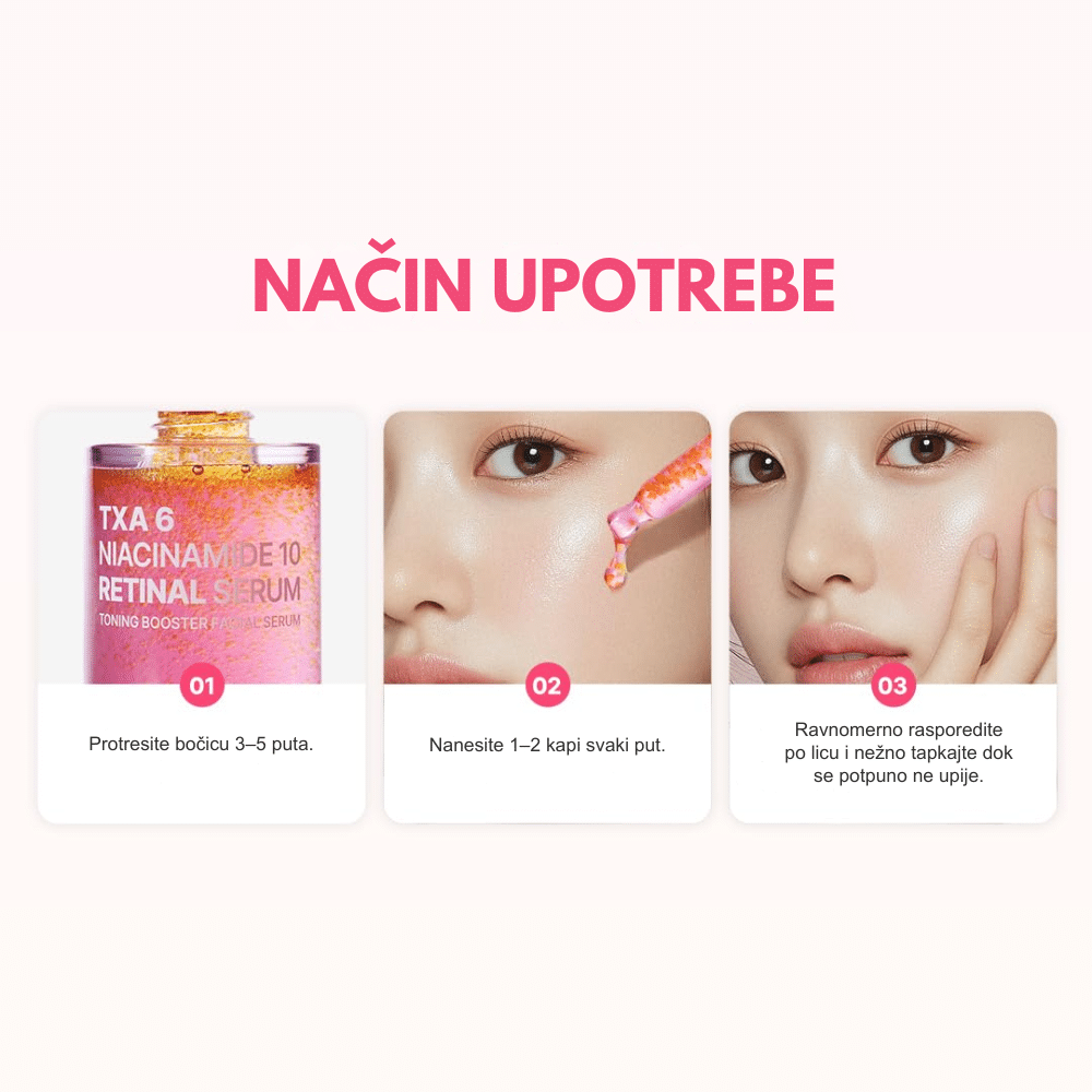 Nakon čišćenja i toniranja, nanesite malu količinu seruma na lice i vrat u večernjoj rutini, izbegavajući predeo oko očiju i usana, i polako uvodite proizvod u upotrebu počevši od dva do tri puta nedeljno dok se koža ne adaptira. Ukoliko primetite jako ljuštenje, crvenilo ili iritaciju, smanjite učestalost korišćenja ili privremeno prekinite sa upotrebom, a tokom dana obavezno koristite kremu sa visokim zaštitnim faktorom (SPF 50+) jer retinal povećava osetljivost kože na sunce. Proizvod se ne preporučuje trudnicama i dojiljama zbog prisustva derivata vitamina A, a treba ga čuvati na tamnom i hladnom mestu kako bi se očuvala stabilnost aktivnih sastojaka.