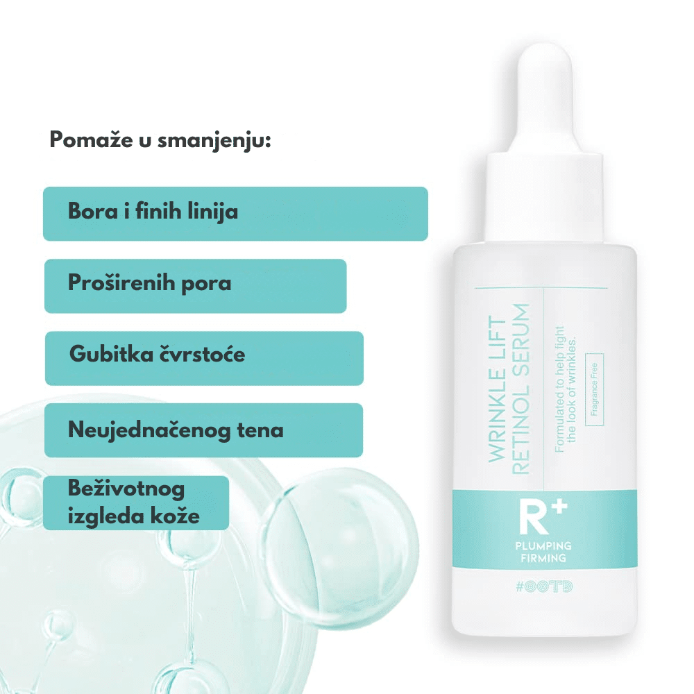 OOTD Wrinkle Lift Retinol Serum je intenzivan serum protiv bora koji kombinuje retinil palmitat (blaga forma vitamina A) i vodu od vitamina drveća („Vitamin Tree Water“) za ublažavanje vidljivih znakova starenja, nežno izjednačavanje tena i zaglađivanje kože — bez lepljivog osećaja.