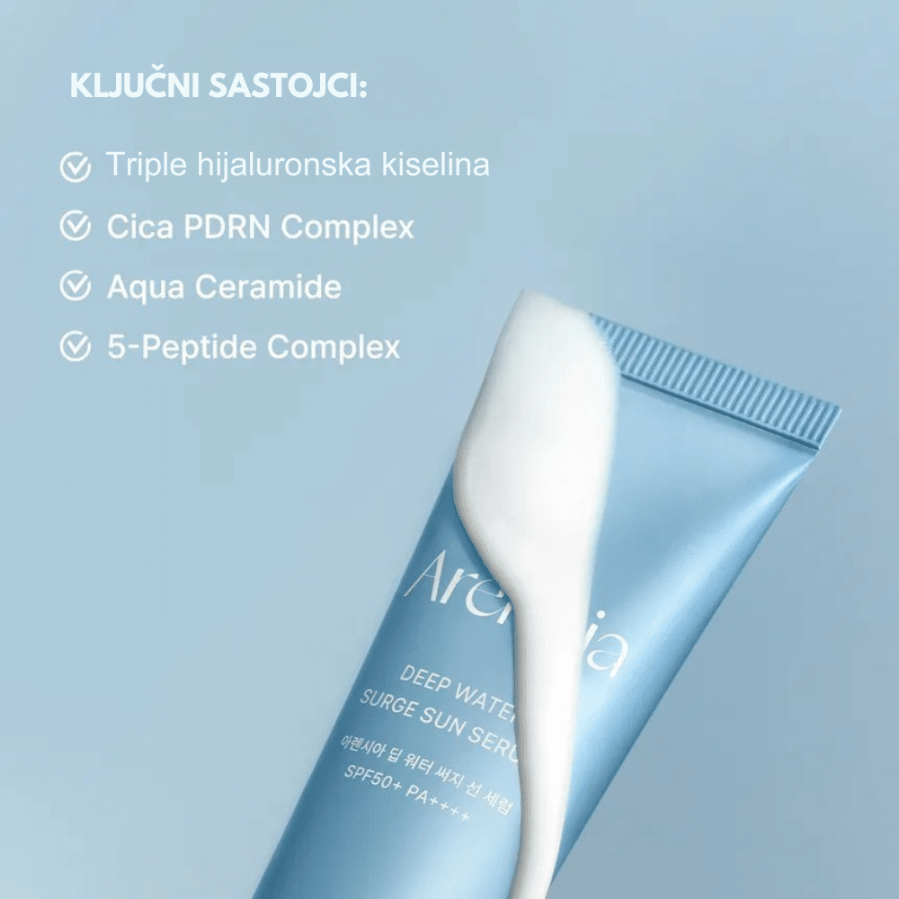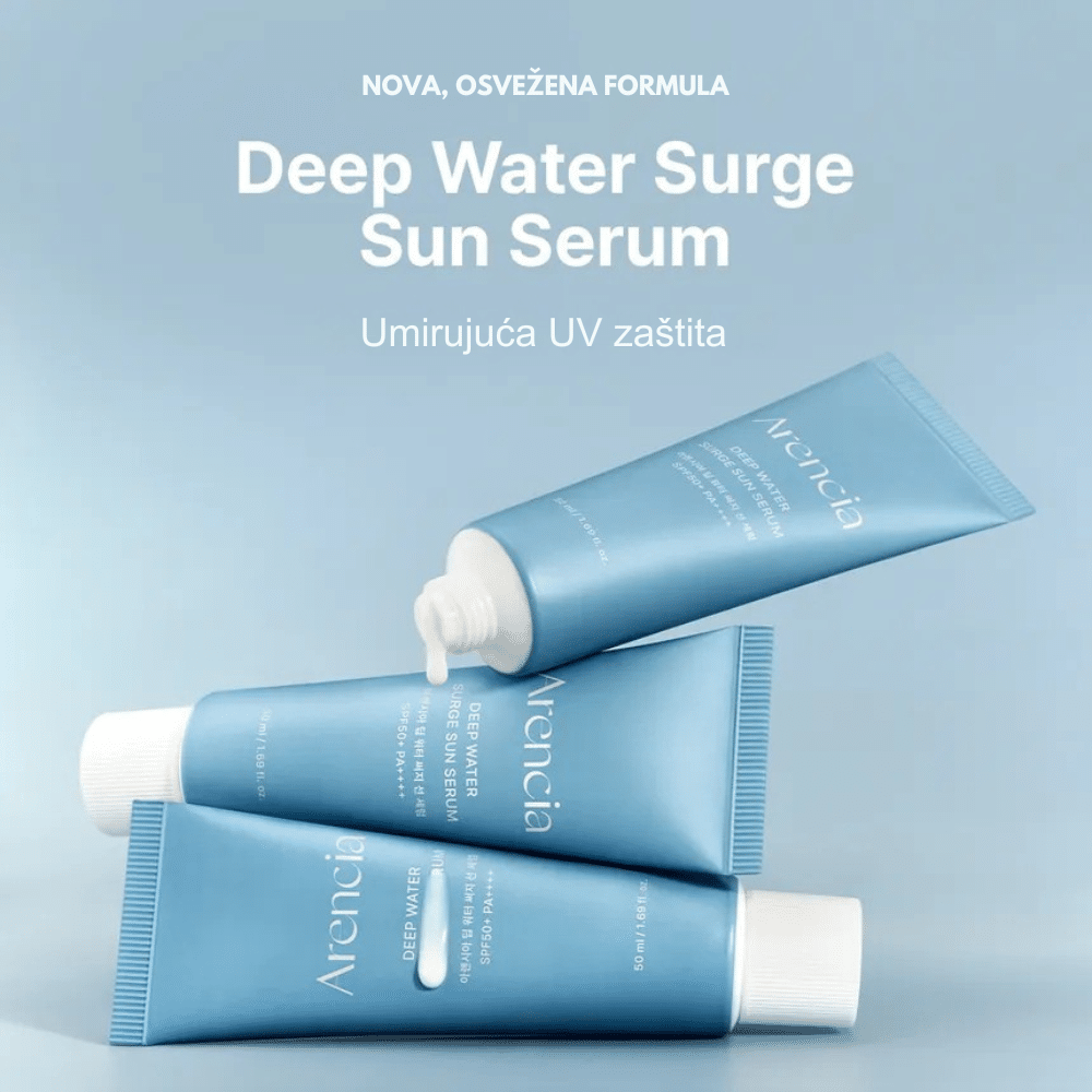 ARENCIA Deep Water Surge Sun Serum SPF50+ PA++++ je lagani zaštitni serum koji pruža visoku zaštitu od UVA i UVB zračenja uz intenzivnu hidrataciju kože. Vodena, neljepljiva tekstura brzo se upija, ne ostavlja beli trag i idealna je za svakodnevnu upotrebu, čak i ispod šminke.