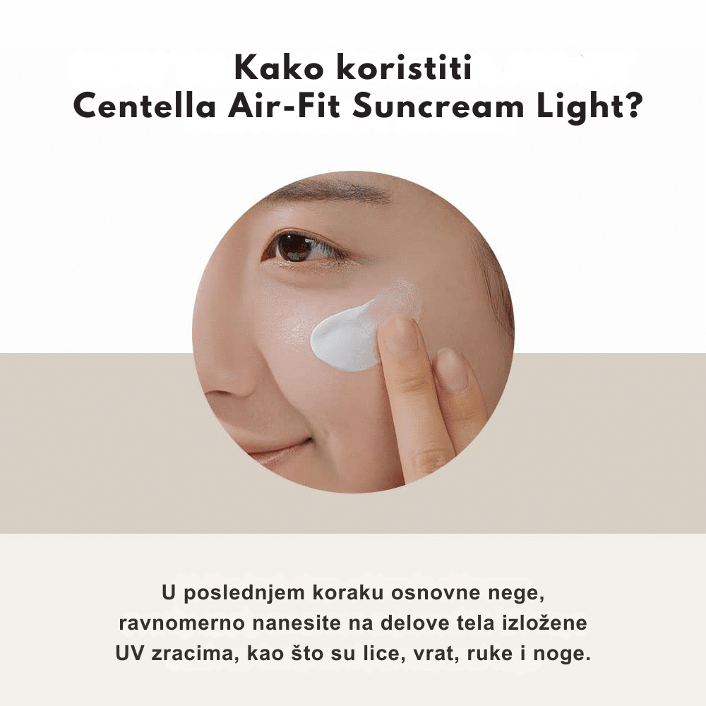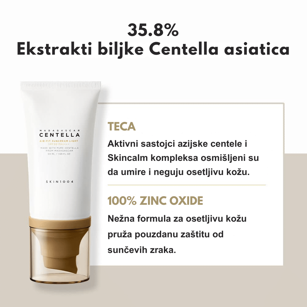 SKIN1004 Madagascar Centella Air-Fit Suncream Light je lagana mineralna krema za sunčanje koja pruža zaštitu širokog spektra sa SPF30 PA++++. Formulisana sa 29,4% ekstrakta Centella Asiatica, poznatog po umirujućim i regenerativnim svojstvima, ova krema štiti kožu od štetnih UV zraka dok istovremeno hidrira i umiruje iritacije. Zahvaljujući cink oksidu kao aktivnom sastojku, pruža efikasnu fizičku zaštitu od sunca bez iritacija, što je čini pogodnom za osetljivu kožu. Lagana tekstura omogućava lako nanošenje i brzo upijanje bez ostavljanja belih tragova ili masnog osećaja.
