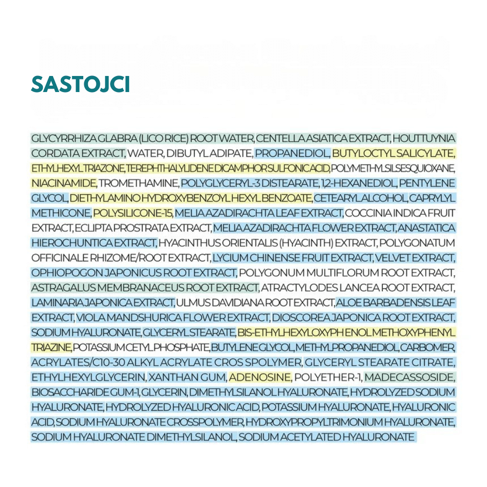 Water, Dibutyl Adipate, Propanediol, Diethylamino Hydroxybenzoyl Hexyl Benzoate, Polymethylsilsesquioxane, Ethylhexyl Triazone, Niacinamide, Methylene Bis-Benzotriazolyl Tetramethylbutylphenol, Coco-Caprylate/Caprate, Caprylyl Methicone, Diethylhexyl Butamido Triazone, Glycerin, 1,2-Hexanediol, Butylene Glycol, Centella Asiatica Extract, Glycyrrhiza Glabra (Licorice) Root Extract, Houttuynia Cordata Extract, Artemisia Capillaris Extract, Adenosine, Pentylene Glycol, Behenyl Alcohol, Poly C10-30 Alkyl Acrylate, Polyglyceryl-3 Methylglucose Distearate, Decyl Glucoside, Tromethamine, Carbomer, Acrylates/C10-30 Alkyl Acrylate Crosspolymer, Sodium Stearoyl Glutamate, Polyacrylate Crosspolymer-6, Ethylhexylglycerin, Xanthan Gum.