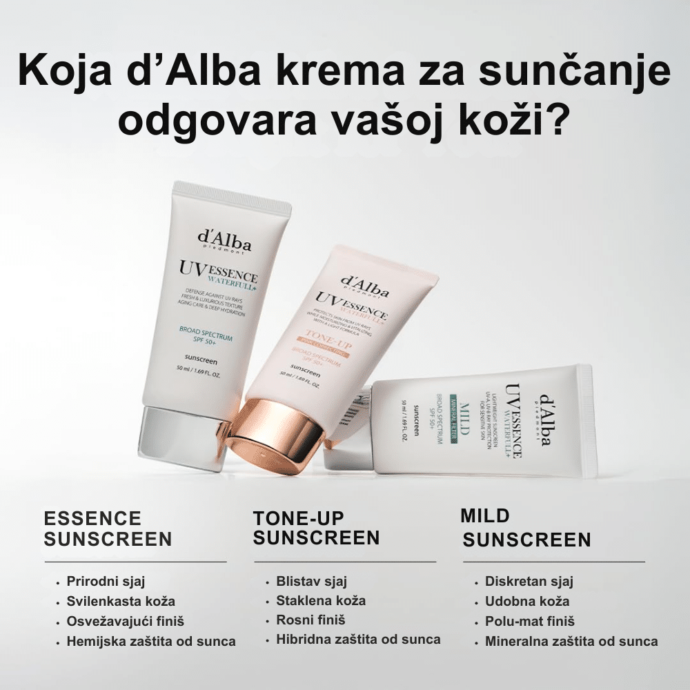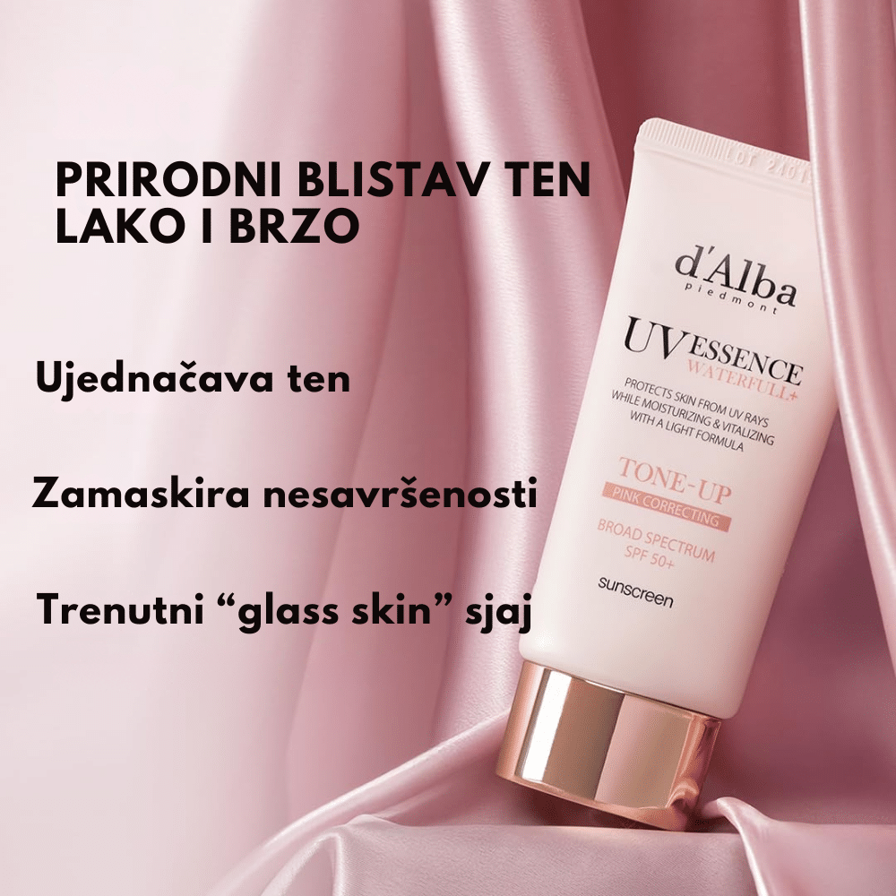 d’Alba Waterfull Tone-Up Sun Cream (Pink) je SPF50+ PA++++ krema za sunčanje sa blagim pink ton-up efektom koja ujednačava ten i pruža zaštitu od UV zračenja. Lagana tekstura hidrira kožu i ostavlja prirodno osvežen izgled.