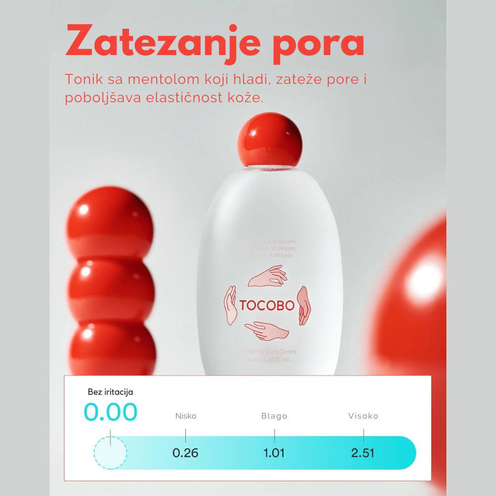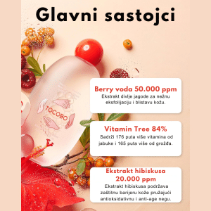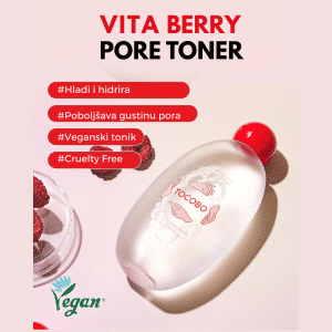 TOCOBO Vita Berry Pore Toner kombinuje visoke koncentracije vitamina i biljnih ekstrakata da zategne pore, balansira sebum i podstakne blagi piling. Formulisan je sa vitamin tree vodom (~84 %), berry vodom i hibiskus ekstraktom, što osigurava blistav i čvršći ten bez iritacije. Lagane teksture i rashlađujući efekat čine ga idealnim za masnu i kombinovanu kožu.