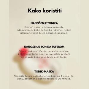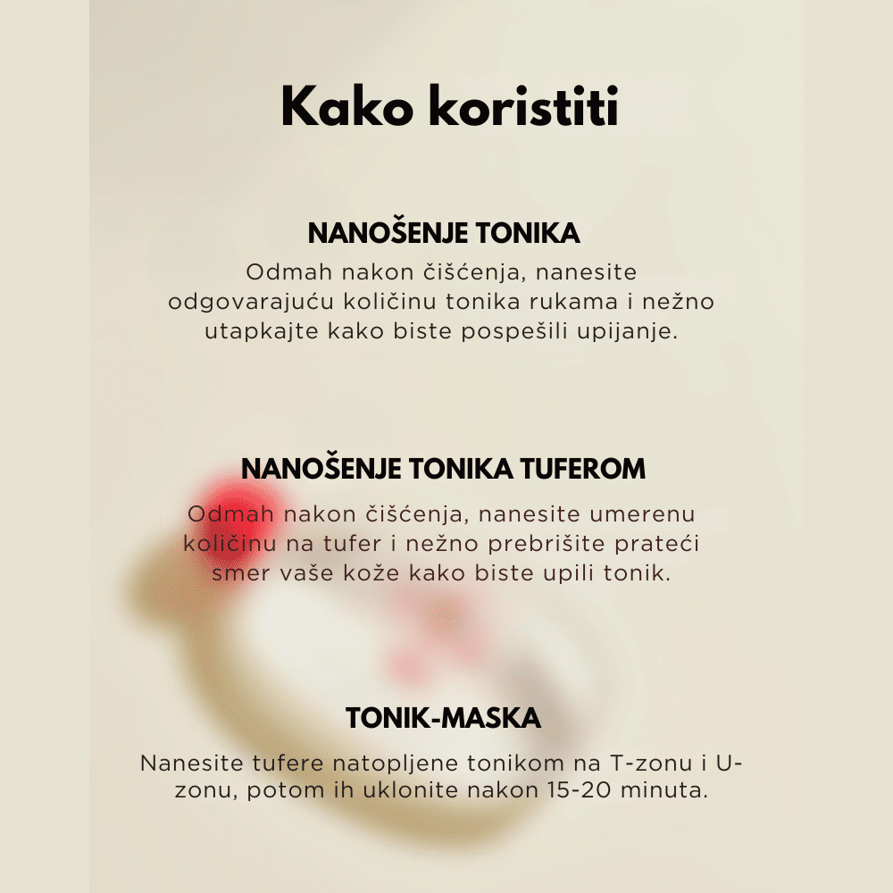 Nakon čišćenja, naneti tonik u dlanove i utapkati na lice ili prebisati blaznicom duž teksture kože. Može se koristiti i kao maska — natopiti blaznice tonikom i ostavi 15–20 minuta na područjima sa proširenim porama. Nastaviti negu hidratantnim proizvodima. Prekini upotrebu ukoliko se javi iritacija.
