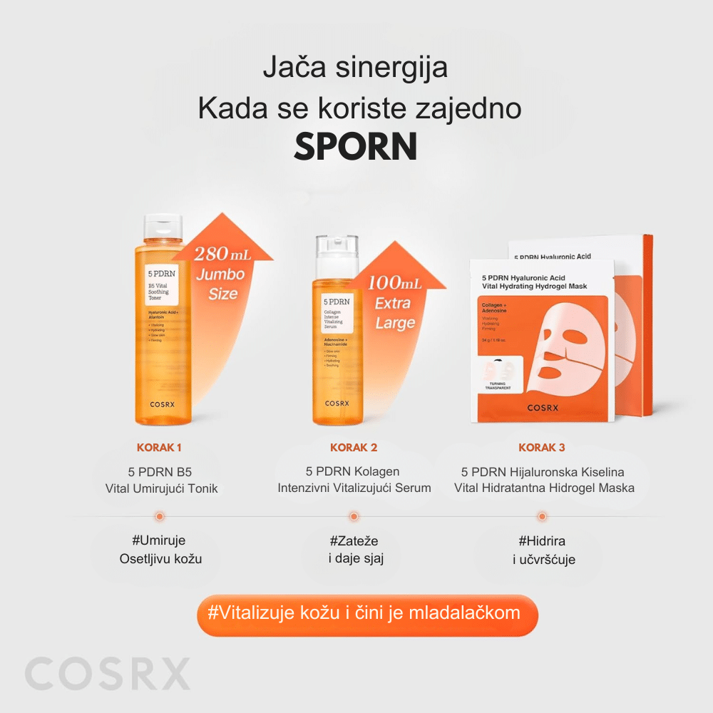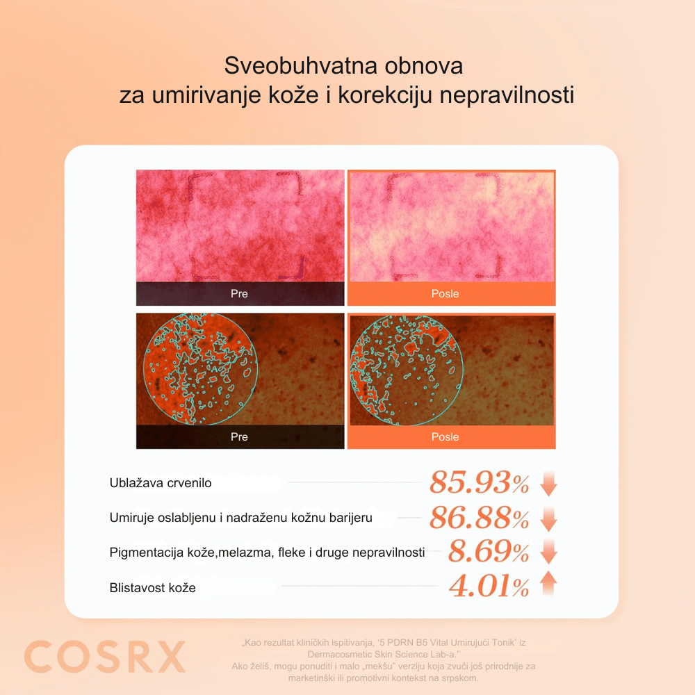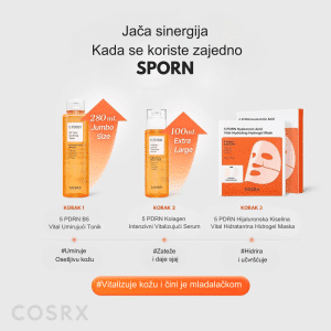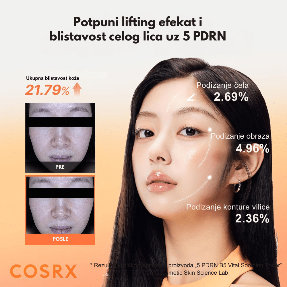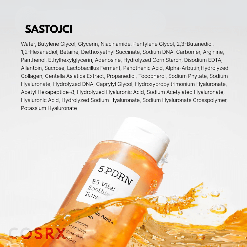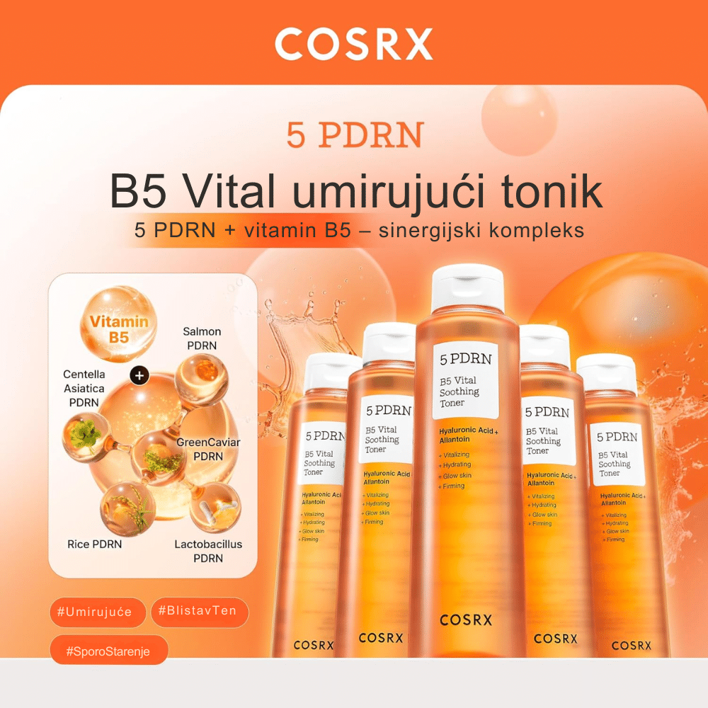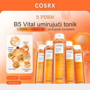 Cosrx 5 PDRN B5 Vital Soothing Toner predstavlja esencijalni prvi korak u naprednoj regenerativnoj nezi lica, dizajniran da momentalno umiri iritacije i postavi temelje za dubinsku obnovu kože. Ovaj toner velike zapremine kombinuje snagu biljnog PDRN-a (natrijum DNK) sa visokom koncentracijom pantenola (vitamin B5), stvarajući sinergiju koja ne samo da hidrira, već aktivno popravlja narušenu zaštitnu barijeru. Njegova lagana, vodenasta tekstura prodire duboko u pore, ublažavajući crvenilo i osećaj zatezanja odmah nakon čišćenja, dok istovremeno podstiče vitalnost ćelija. Formula je kreirana da “napumpa” kožu vlagom i pripremi je za bolju apsorpciju seruma i krema, ostavljajući ten mekim, osveženim i vidno zdravijim. Zahvaljujući umirujućim svojstvima, ovaj toner deluje kao terapeutska infuzija za stresiranu kožu, vraćajući joj prirodni balans i otpornost na spoljne agresore. Savršen je za postizanje glatke teksture i dugotrajnog osećaja prijatnosti bez ikakvog lepljivog ostatka.