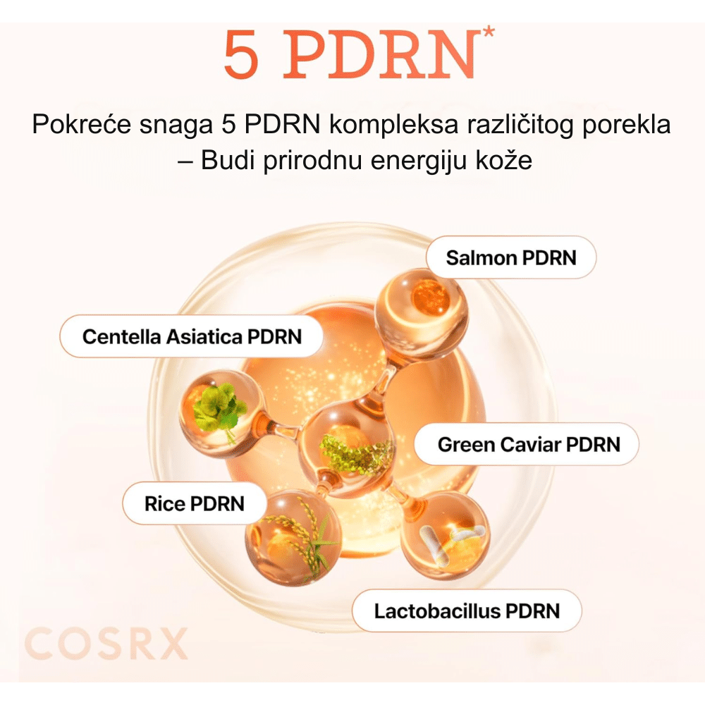 PDRN (polideoksiribonukleotid) je moćan regenerativni sastojak dobijen iz DNK lososa, poznat po svojoj sposobnosti da ubrza oporavak i obnovu kože na ćelijskom nivou. Deluje tako što stimuliše proizvodnju kolagena i elastina, poboljšava elastičnost i hidrataciju kože, dok istovremeno jača njenu zaštitnu barijeru. Ima snažna anti-age i reparativna svojstva, pomaže u smanjenju bora, finih linija i oštećenja uzrokovanih UV zračenjem i spoljašnjim faktorima. Takođe ima antiinflamatorni efekat, smiruje crvenilo i pomaže u lečenju osetljive i iritirane kože. Najčešće se koristi u anti-age serumima, kremama, esencijama i tretmanima za dubinsku regeneraciju, a često se primenjuje i u profesionalnim estetskim procedurama za podmlađivanje i oporavak kože. Idealan je za zrelu, oštećenu i dehidriranu kožu kojoj je potrebna dodatna nega i revitalizacija.