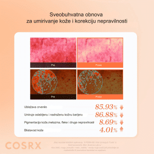 Cosrx je korejski kozmetički brend poznat po svojoj efikasnosti i jednostavnim, ali visokokvalitetnim proizvodima za negu kože. Osnovan 2013. godine, Cosrx je postao popularan zahvaljujući svojoj posvećenosti stvaranju proizvoda koji koriste minimalan broj sastojaka, ali sa maksimalnim učinkom, što ih čini idealnim za osetljivu kožu. Brend nudi širok spektar proizvoda, uključujući serume, tonere, maske i kreme, sa naglaskom na upotrebi sastojaka kao što su AHA, BHA, niacinamid, propolis i drugi biljni ekstrakti. Njihovi proizvodi su veganski, cruelty-free i ne sadrže parabene, sulfate ili veštačke mirise. Cosrx je prepoznat po svojoj jednostavnoj, ali efikasnoj formuli koja pomaže u rešavanju problema sa kožom kao što su akne, suvoća i nepravilnosti. Takođe, brend se ističe svojom posvećenostšću naučnoj i dermatološkoj istraživačkoj osnovi.