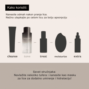 Naneti toner na dlanove ili tupfer i nežno utapkati na čistu kožu lica. Koristiti ujutru i uveče nakon čišćenja.