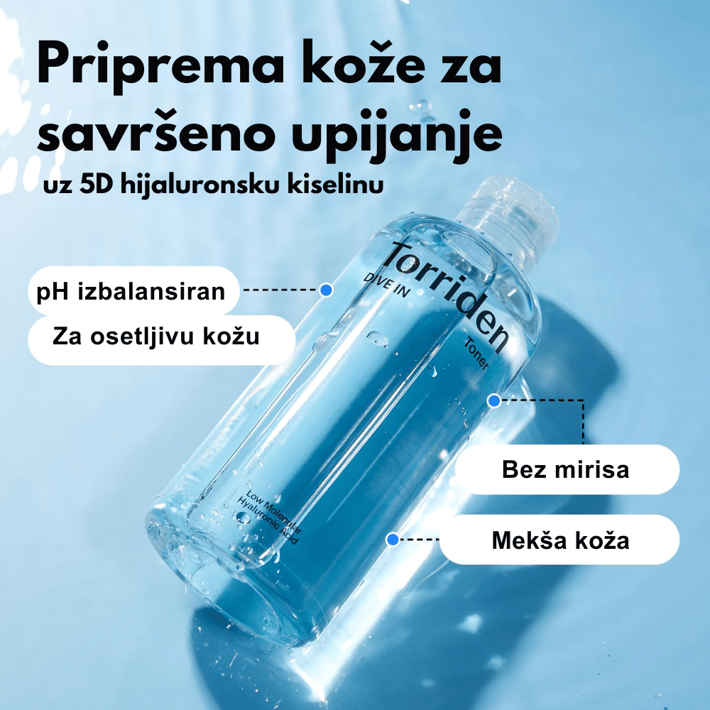 Torriden DIVE IN Toner pruža intenzivnu hidrataciju zahvaljujući 5-D kompleksu hijaluronske kiseline i pantenolu, dok alantoin umiruje kožu — idealan za pripremu kože posle čišćenja i pre daljih koraka nege.