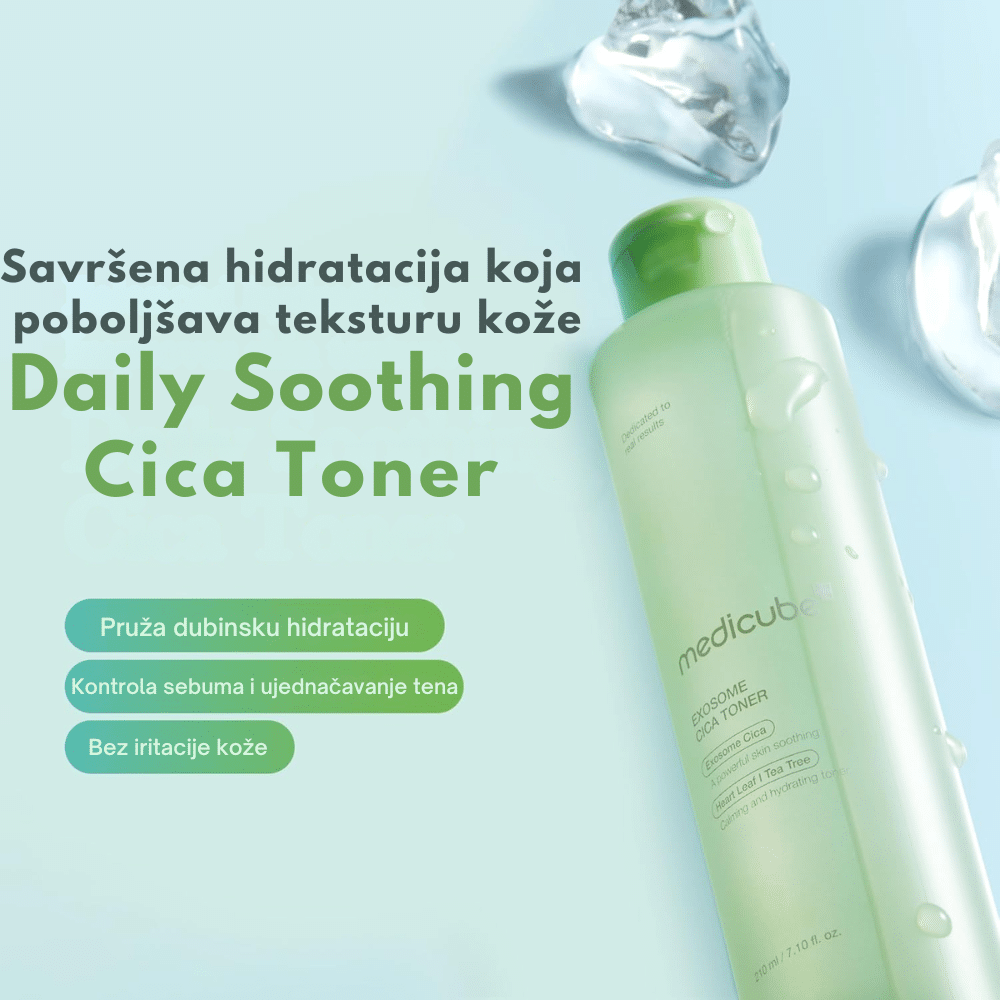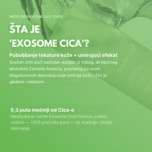 Medicube Exosome Cica Toner je umirujući i regenerativni tonik formulisan sa CICA kompleksom i eksozomima koji pomažu u obnavljanju kože i jačanju njene barijere. Ova inovativna formula hidrira, smanjuje crvenilo i podržava prirodni proces regeneracije kože. Zahvaljujući centella asiatica ekstraktu, pantenolu i madecassosideu, tonik umiruje iritacije i održava optimalan nivo vlage, dok ekskluzivna Exosome tehnologija doprinosi boljem upijanju aktivnih sastojaka. Idealno rešenje za osetljivu i reaktivnu kožu kojoj je potrebna ravnoteža i obnova.