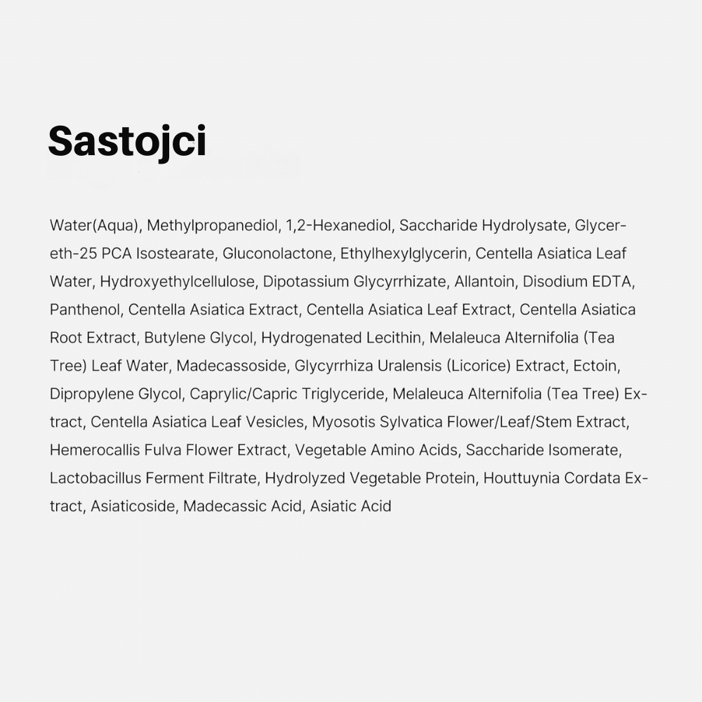 Water, Centella Asiatica Extract, Madecassoside, Panthenol, Asiaticoside, Asiatic Acid, Madecassic Acid, Exosome, Glycerin, Butylene Glycol, Sodium Hyaluronate, Allantoin, Betaine, Hydroxyethylcellulose, Carbomer, Arginine, Disodium EDTA, Ethylhexylglycerin, Phenoxyethanol.