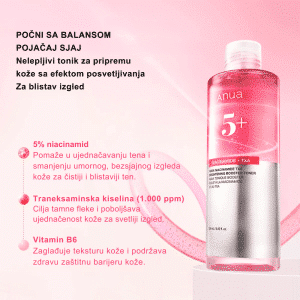 Ovaj “booster” toner ne deluje samo na površini; njegova formula je optimizovana da poboljša ukupnu teksturu kože i suzi proširene pore. Redovnom upotrebom, koža gubi beživotan i sivkast ton, postajući vidno ujednačenija, glatka i blistava. Zahvaljujući sinergiji kiselina i vitamina, ovaj proizvod pruža efekt “staklene kože” (glass skin) po kojoj je Anua prepoznatljiva, čineći ga nezaobilaznim korakom za sve koji se bore sa neujednačenim pigmentom i gubitkom prirodnog sjaja.