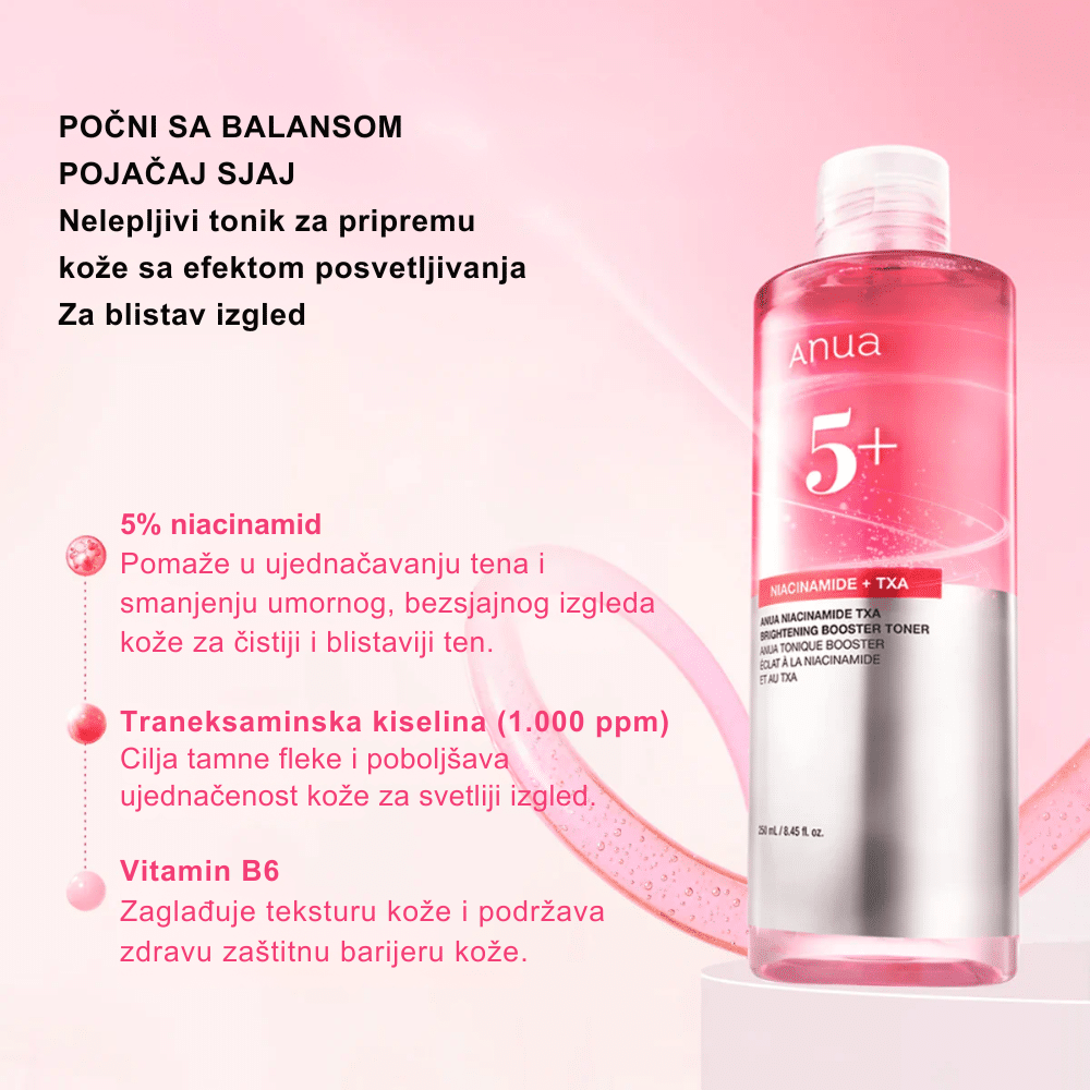 Anua Niacinamide TXA Brightening Booster Toner je visokoefikasan tretman dizajniran za dubinsko prosvetljivanje tena i suzbijanje svih oblika hiperpigmentacije. Ovaj toner kombinuje moćne aktivne sastojke koji ciljano deluju na melanocite, sprečavajući nastanak novih fleka dok istovremeno blede postojeće ožiljke od akni, sunčeve pege i melazmu. Tekstura je lagana i vodenasta, što omogućava brzo upijanje bez lepljivog osećaja, ostavljajući kožu momentalno hidriranom i pripremljenom za naredne korake nege.
