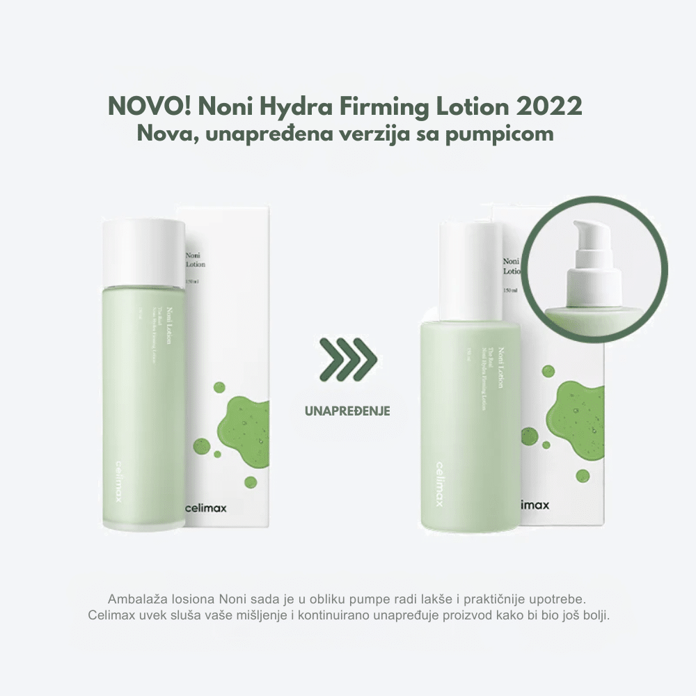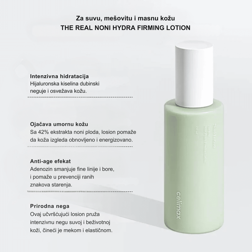 Celimax Noni Lotion je lagani losion za lice koji pruža intenzivnu hidrataciju i pomaže u umirivanju kože. Formulisan za svakodnevnu negu, doprinosi jačanju kožne barijere i ostavlja kožu mekanom, elastičnom i osveženom bez osećaja lepljivosti.