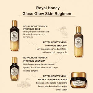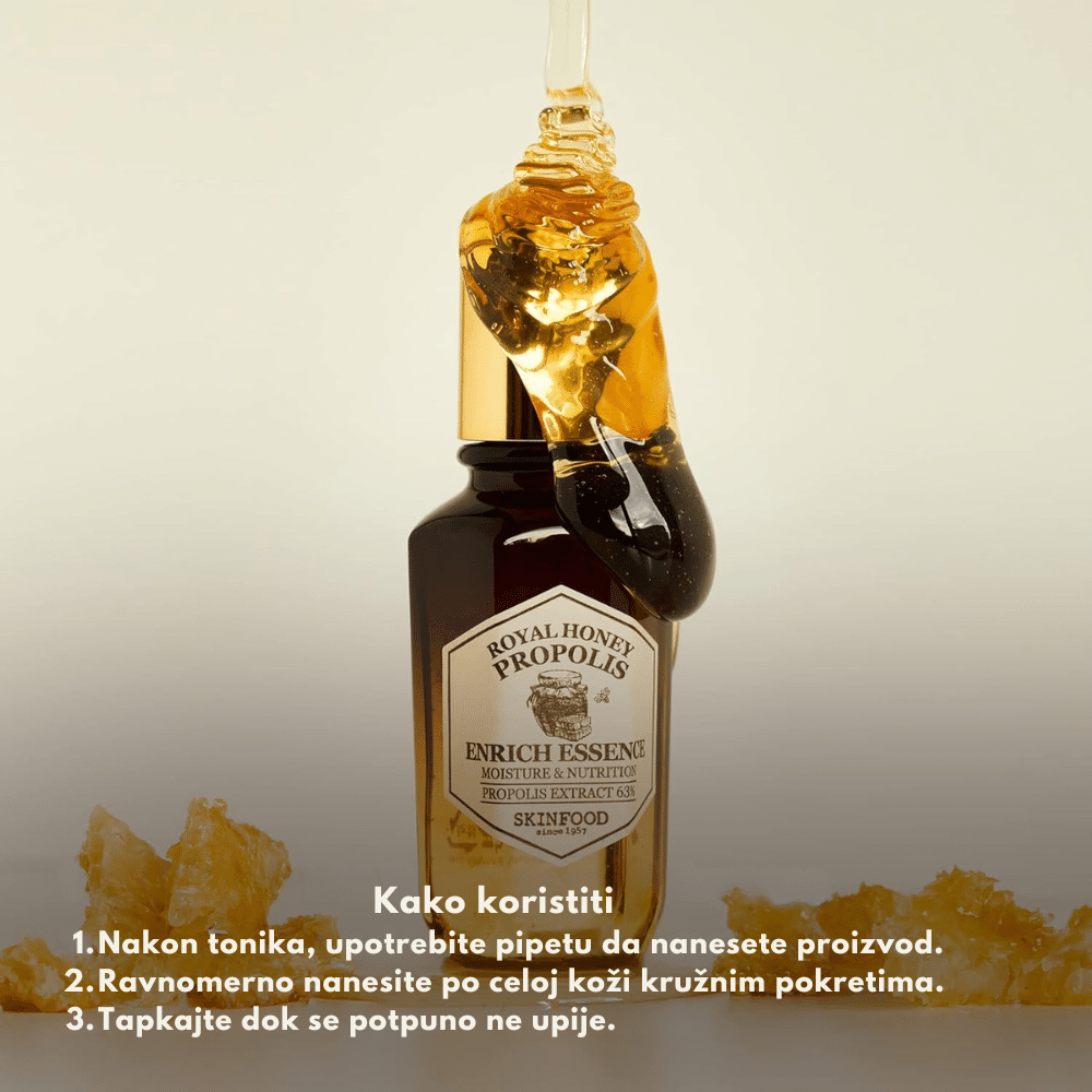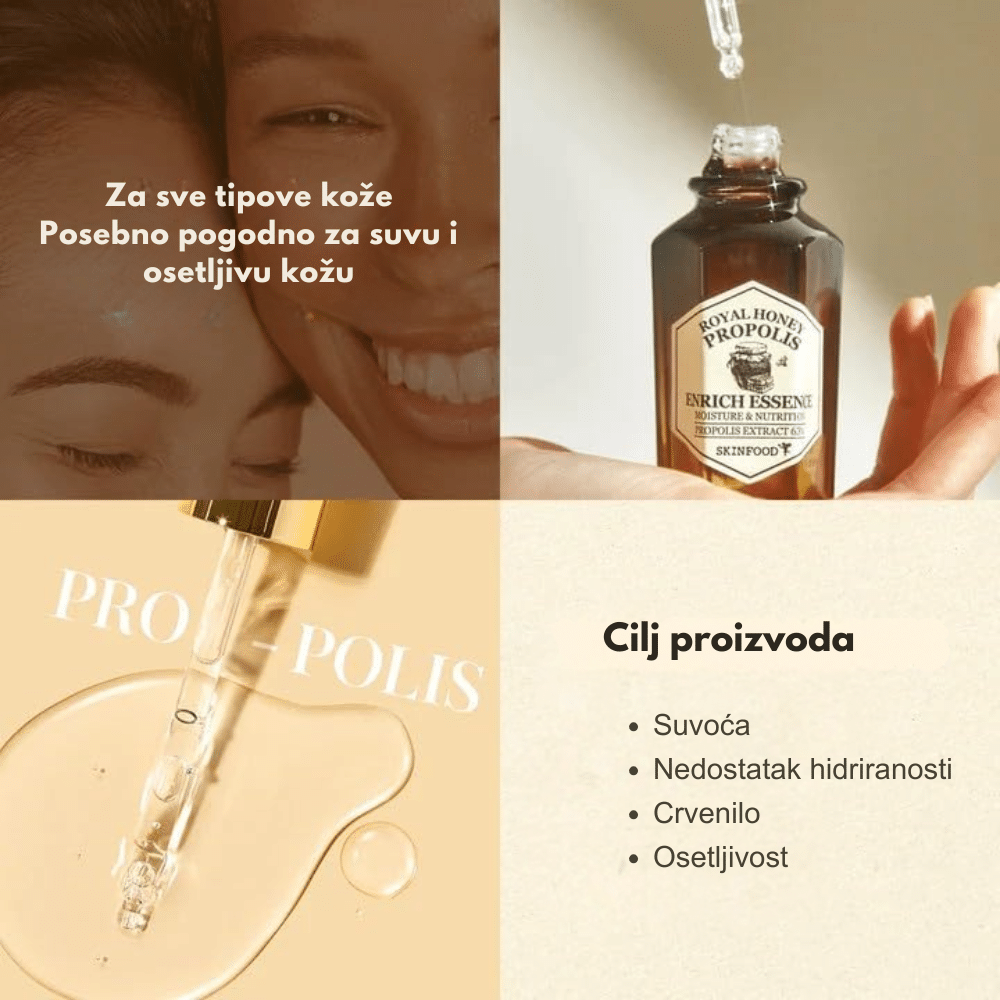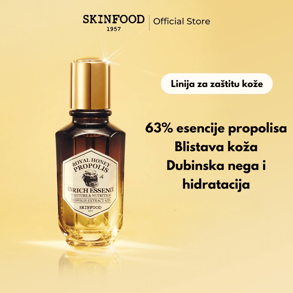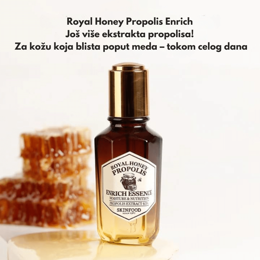 SKINFOOD Royal Honey Propolis Enrich Toner je luksuzni tonik bogat hranljivim i umirujućim sastojcima koji hidrira, jača i revitalizuje kožu. Formulisan sa 16% ekstrakta propolisa, 10% ekstrakta matičnog mleča, i 5% ekstrakta meda, ovaj tonik obnavlja kožnu barijeru, pruža intenzivnu hidrataciju i štiti kožu od spoljašnjih agresora. Njegova bogata, ali brzo upijajuća tekstura savršeno priprema kožu za dalju negu, ostavljajući je glatkom, mekom i blistavom.
