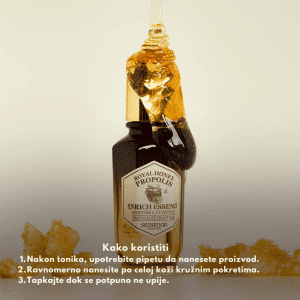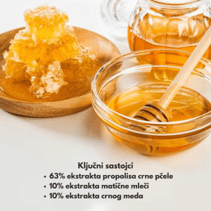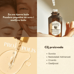 Propolis je smolasta supstanca koju pčele proizvode mešanjem svog voska, enzima i smole sakupljene sa drveća i biljaka. Poznat je po svojim antibakterijskim, antiinflamatornim i regenerativnim svojstvima, što ga čini izuzetno korisnim u nezi kože. Pomaže u umirivanju iritacija, ubrzava zaceljivanje, hidrira kožu i jača njenu barijeru, pa je posebno pogodan za suvu, osetljivu i aknama sklonu kožu. Zahvaljujući bogatstvu antioksidanata, štiti kožu od spoljašnjih agresora i usporava znakove starenja, a često se koristi u serumima, kremama i maskama za lice.