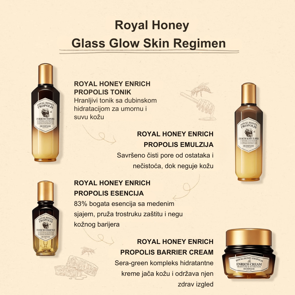 SKINFOOD Royal Honey Propolis Enrich Toner hidrira, jača kožnu barijeru i revitalizuje kožu uz propolis, matično mleko i med.