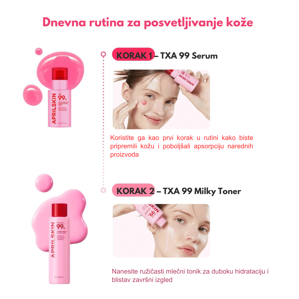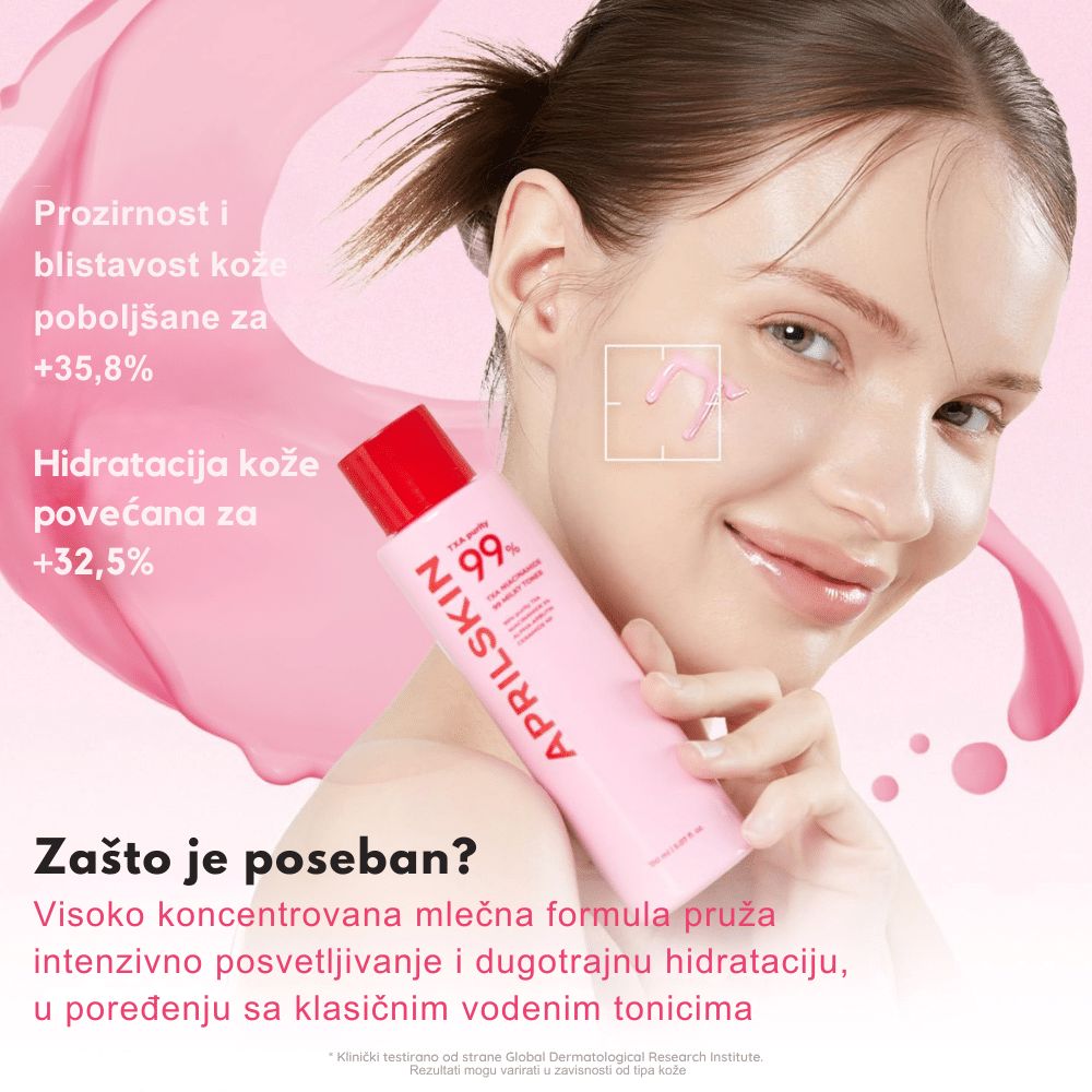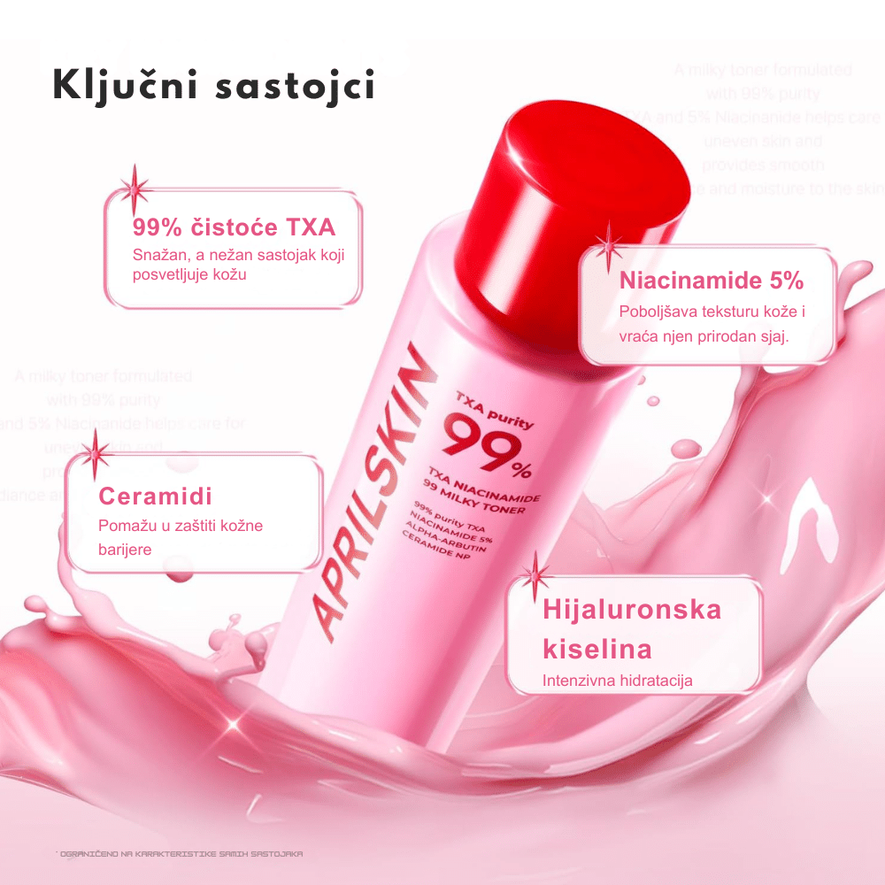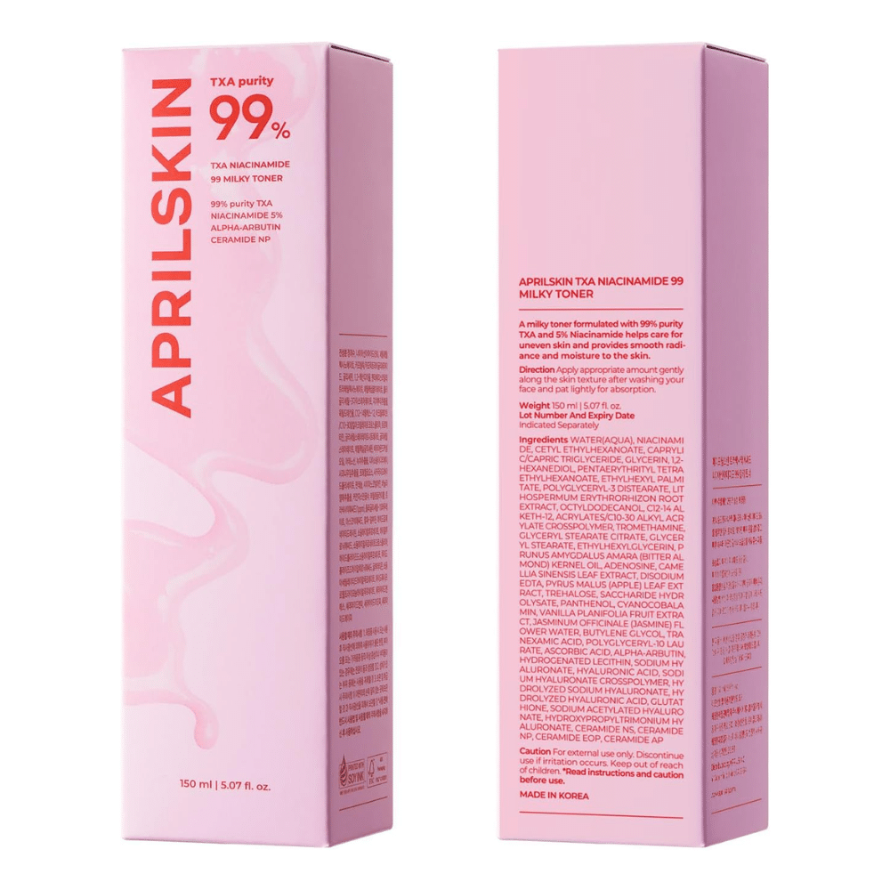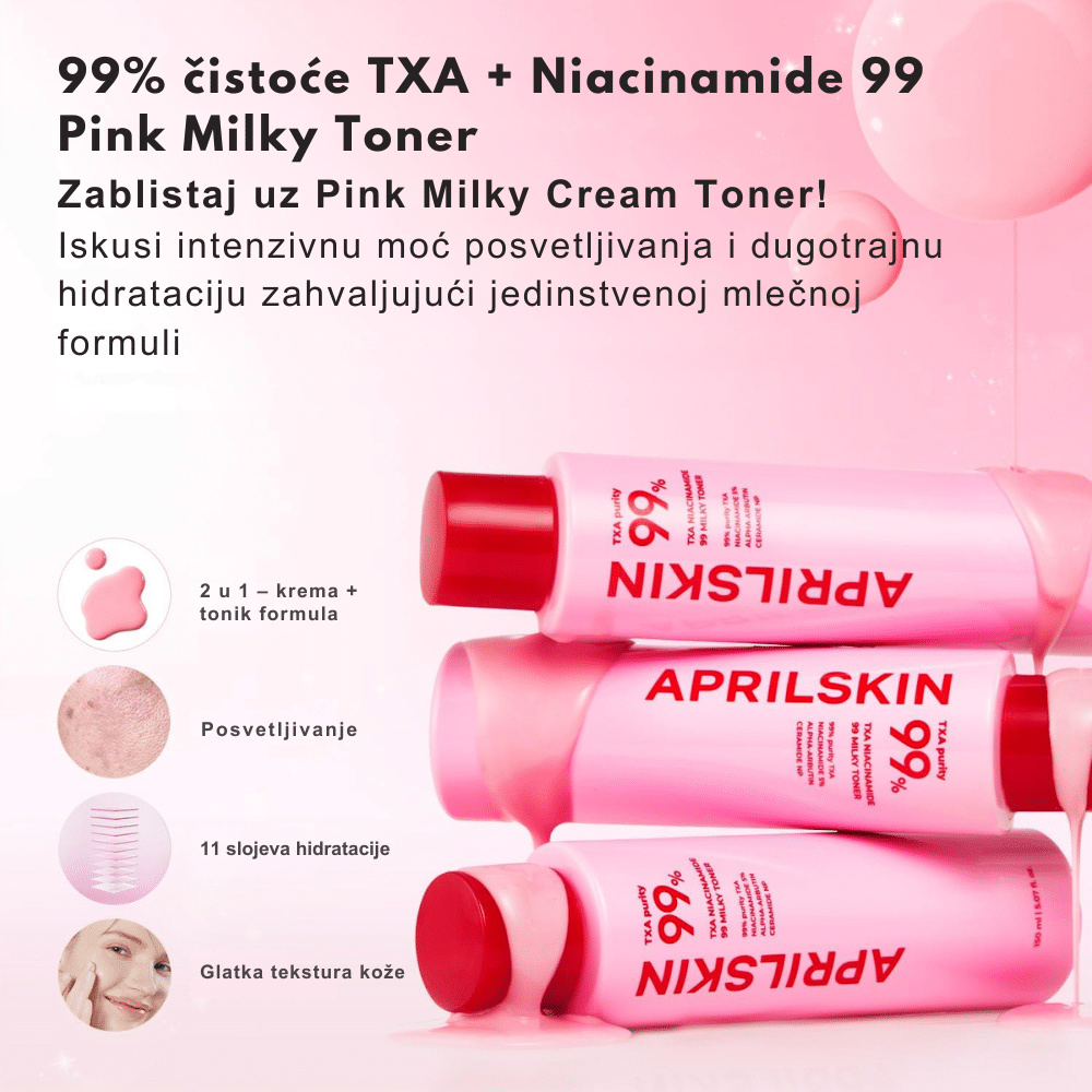 Aprilskin TXA Niacinamide 99 Milky Toner je inovativna 2-u-1 pink “milky” toner-krema koja se transformiše pri kontaktu s kožom. Sa čak 99 % visokopurifikovanog Tranexamic Acid (TXA) i 5 % Niacinamide, pruža intenzivno osvetljenje tena, ujednačavanje boje i duboku hidrataciju bez lepljivog filma. Formula je obogaćena ceramidima i hijaluronom za jačanje barijere kože i efekat “glass skin” sa dugotrajnim svežim sjajem